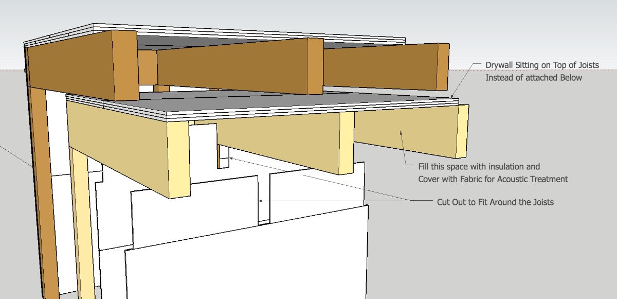 As you can see in the image below, the ceiling drywall are attached on top of the ceiling joists instead of being attached under the joists. The joists for the inner shell will be showing below the ceiling while keeping the ceiling height the same. A possible advantage to this design is that I can utilize spaces between the exposed joists for ceiling acoustic treatment by stuffing them with insulation and covering with fabric. This way I wouldn’t need to build framing specifically for the ceiling treatment.