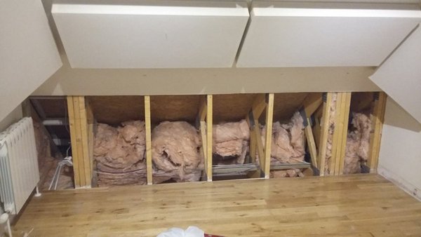 There are a couple of central heating pipes & electrical cable runs, all fortunately out the way of the planned bass trap boxes. I'm going to add extra clips to the cable to ensure they stay flat on the bit of wood they run on. There was a good amount of insulation in the eaves, there won't be room for it all once the bass trap boxes go in, I can reuse it in the bass traps though.