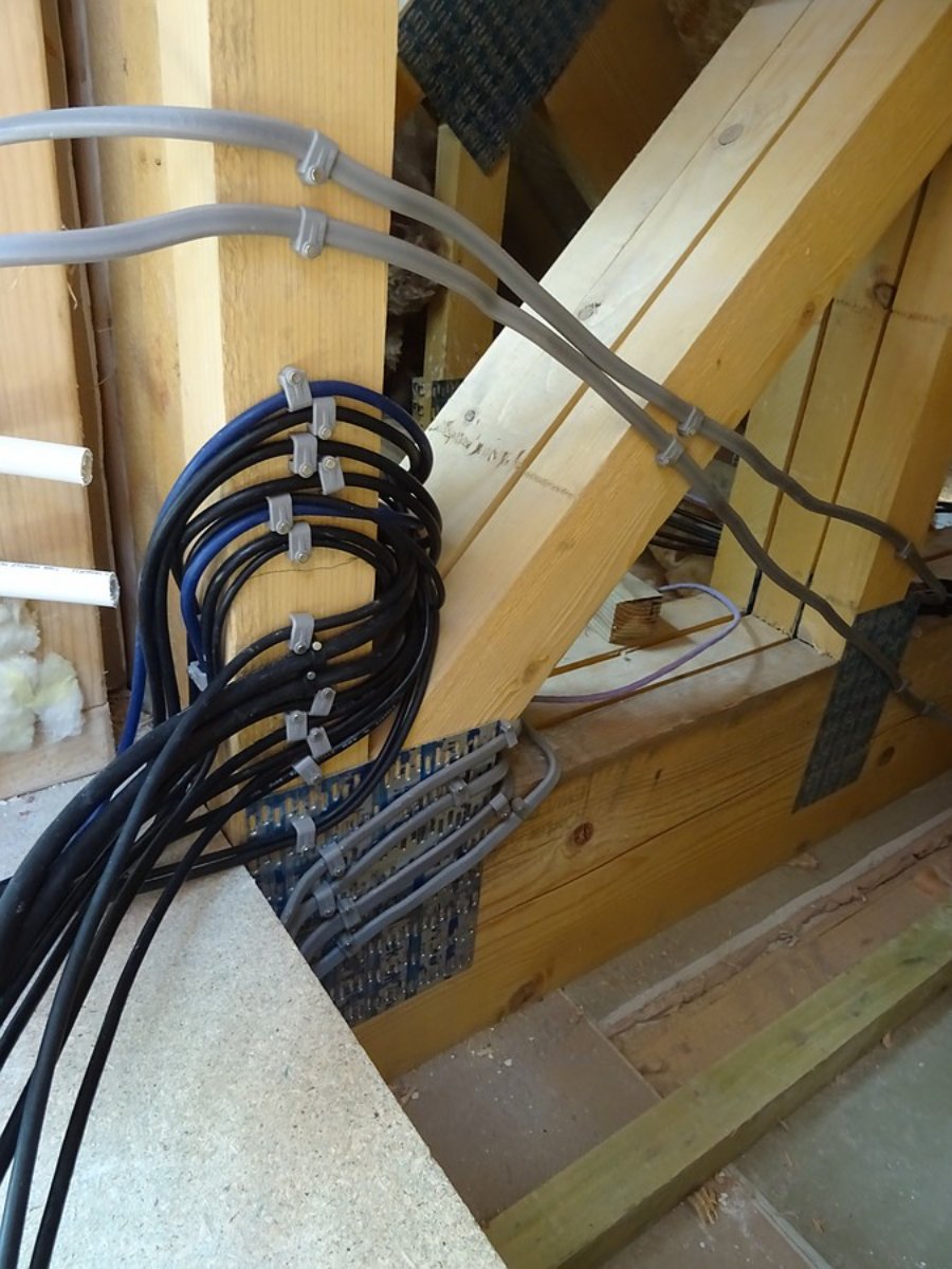 - Tidied up the cabling in the eaves bays for both silencers. The exhaust side bay was a mess - mains cables intruding into the space the silencer will go in to. Fortunately there was enough slack to clip them out the way. The black cables are mostly computer signal ones. They'll be routed along the bottom of the wall. The grey mains cables clipped a foot or so above floor level are for mains sockets on the knee wall. A foot or so higher than that will run the audio snakes to room 2.Terrible photo, but there are four grey mains cables now clipped out the way.