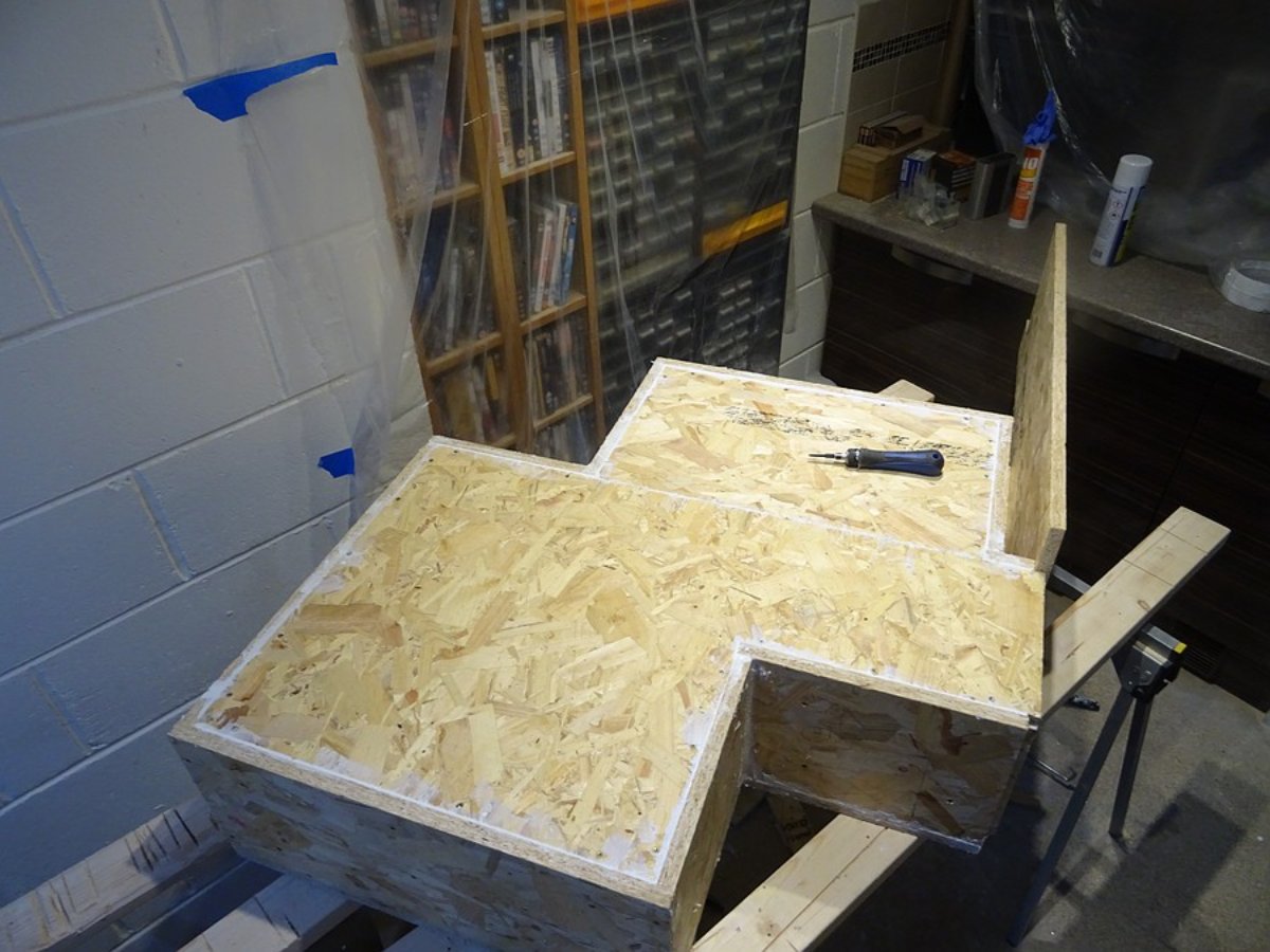 The question solved here was how to attach the side panel so the front edges of it are on the same plane as the panel on the other side. Essential to ensure it will fit flush against the wall OSB board. The answer was to make a small section of temporary wall from an offcut of OSB, and assemble with it in place.