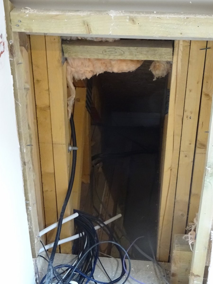 Yesterday (Monday) I spent beefing up the studs forming the left knee wall with methods inspired by those Stuart uses for hanging heavy doors. This is where the exhaust silencer goes. Although constructed correctly and fine for a small bit of plasterboard, the existing stud wall was too weak for the silencer. The vertical stud on the left of these photos was only 20x50mm cross section. All studs were nailed and a bit wibbly wobbly.