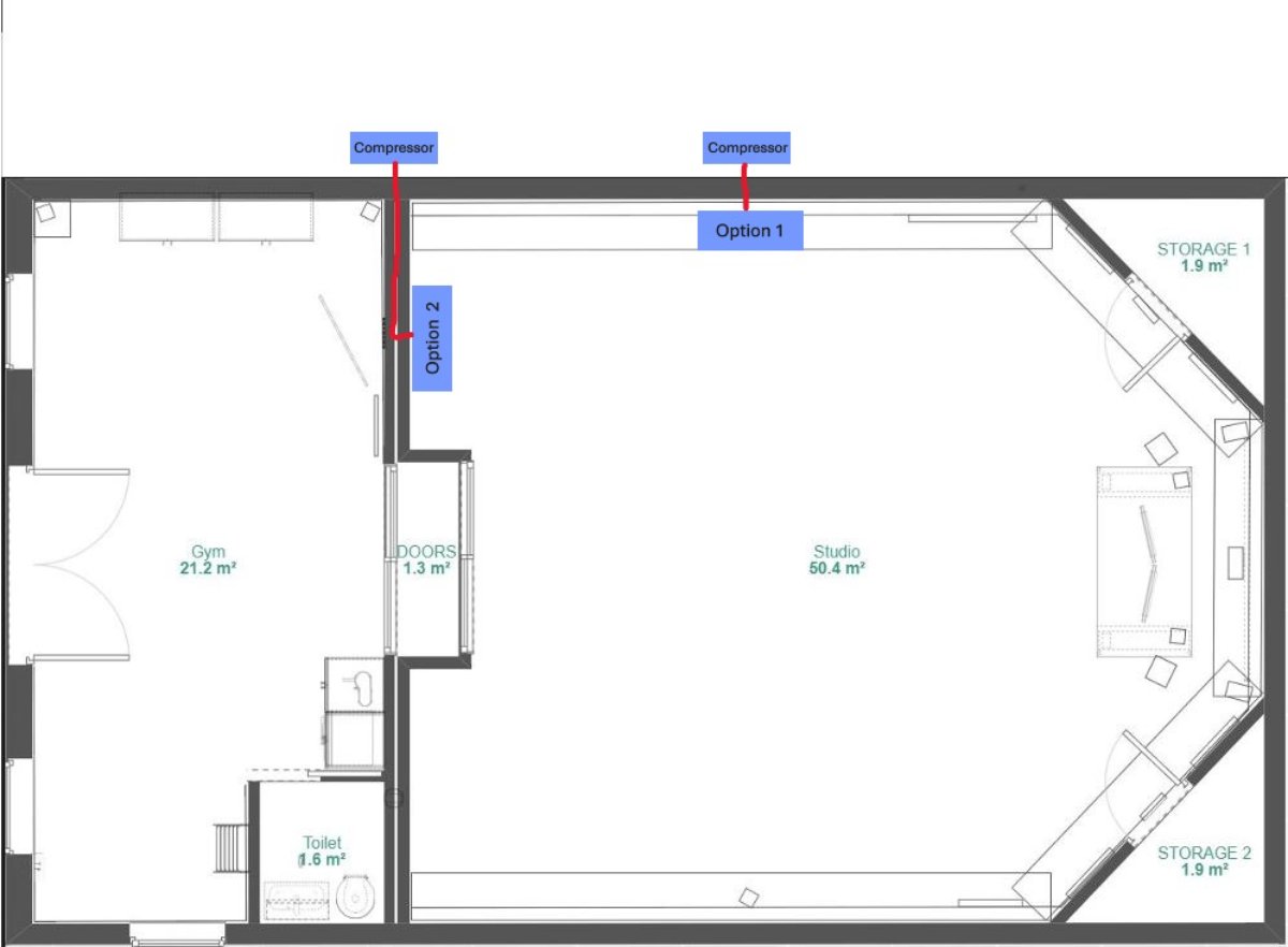 Initially I was thinking of putting the indoor unit on the north wall (Option 1) but another idea emerged: putting it on the wall that separates the gym (Option 2). This way the holes to the outside will be between the two walls.