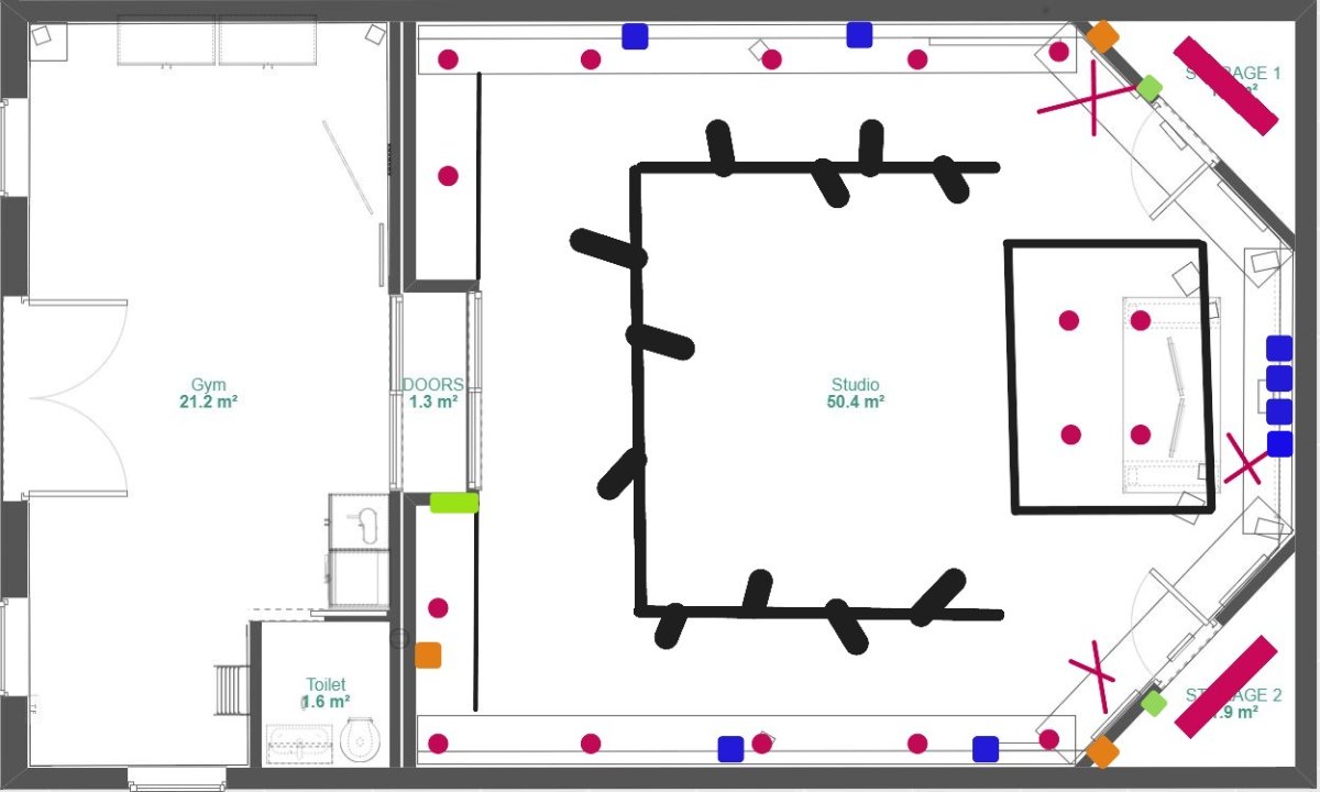 • orange squares = Accessory outlets (not on the studio phase, except for the one in the workshop area)
