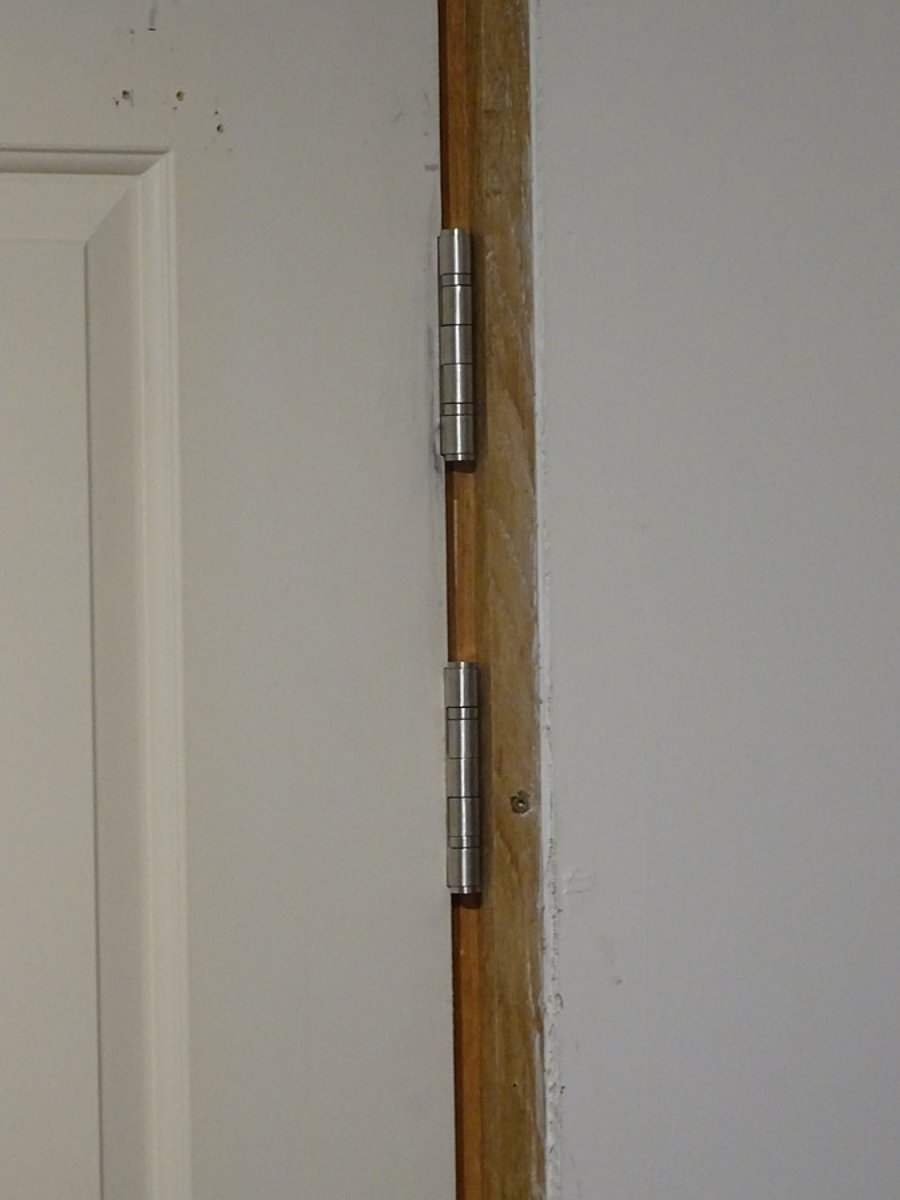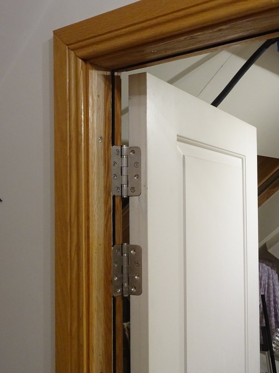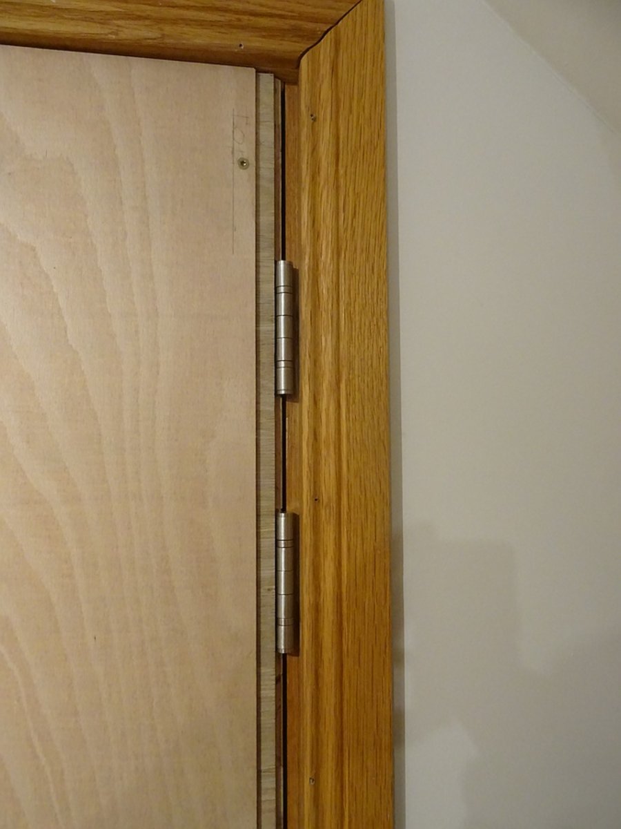 No "bank vault" overlap of the new face was possible along the hinge edge, but the compression between the door edge and frame here will be very high and allow multiple good seals anyway.
