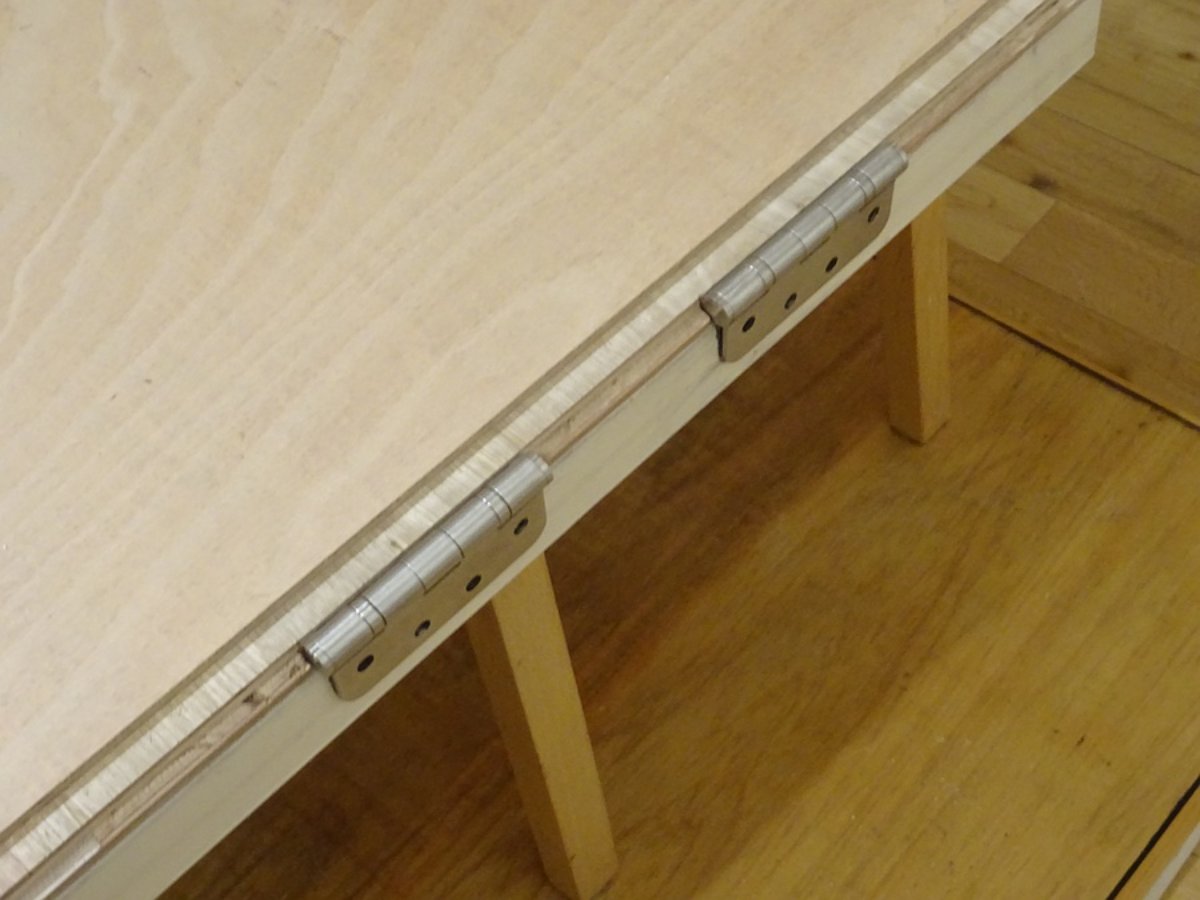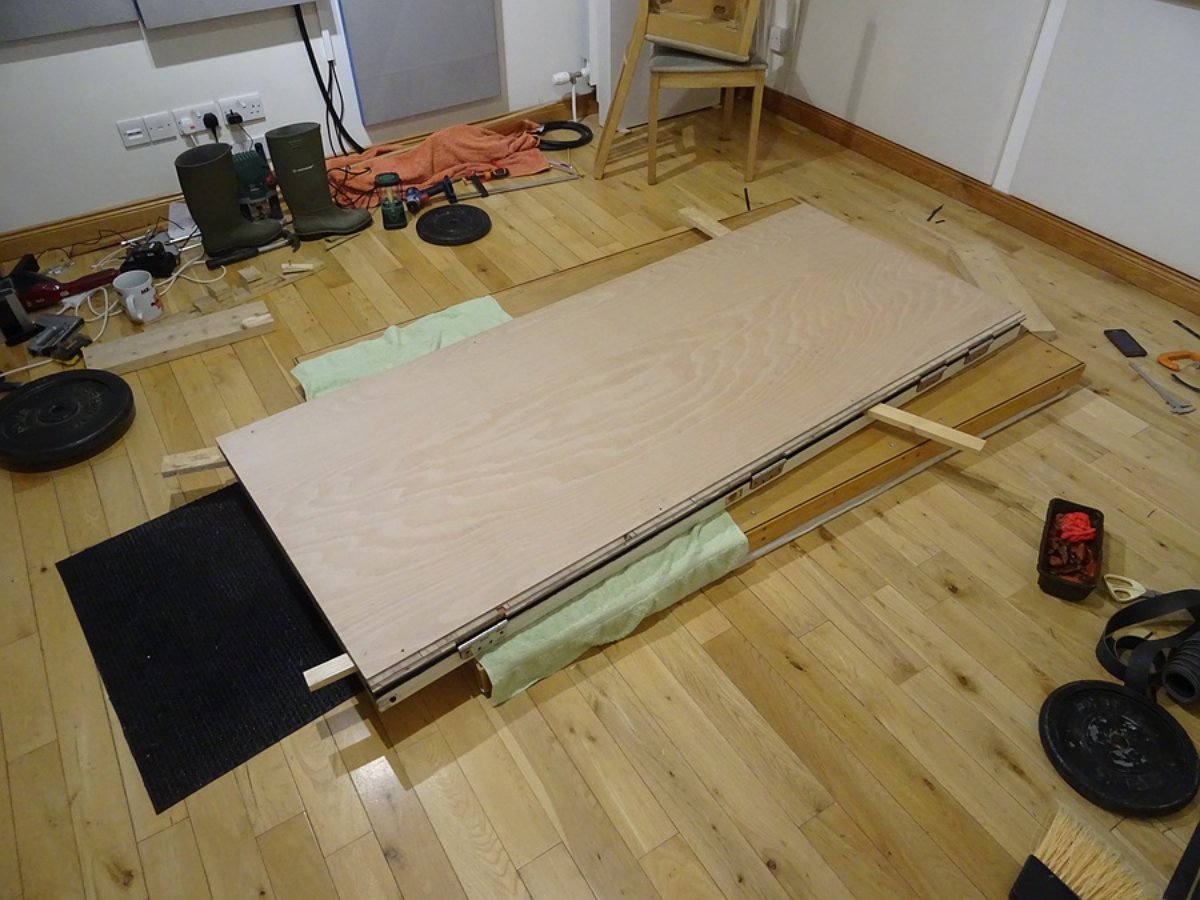 Then I put the (now much heavier) door face on top of this lot. The wooden props let me position it in place without disturbing the panel fixing assembly.