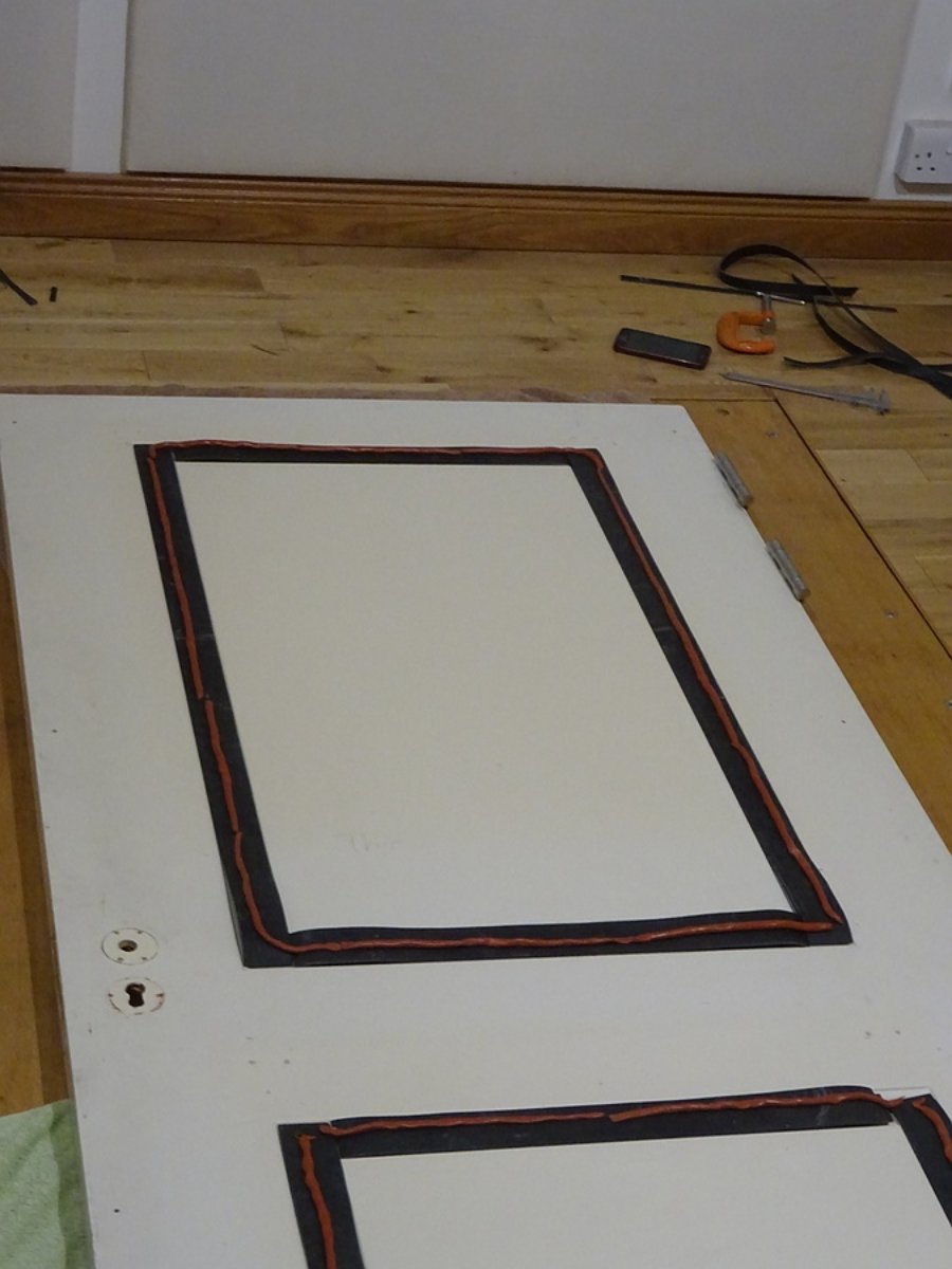 Then unhinged the door - again - and added several layers of MLV to the parts where the panels are recessed. The door is thinner there, and therefore lighter, so this will significantly reduce its overall sound attenuation. Adding extra mass with 2 layers of MLV makes up for it. I rolled out some putty to ensure the MLV was fixed in place and doesn't rattle about.