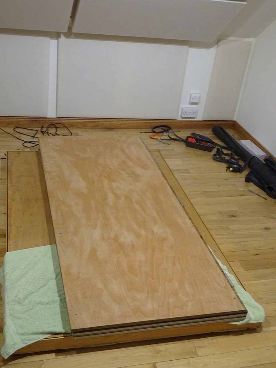 I did it by pulling the green towel forward a foot or so to prevent the door scratching the floor. Then moved 40kg of weight plates on a rubber mat in front of the riser to provide a pivot for the bottom of the door to butt against when I lifted it. Then I grabbed the other end of the door (at the back of the room) and lifted it against the pivot until vertical, then slid it along on the towel to the door frame. Once there, I pushed a wedge under the door to ensure the hinges were aligned with their screw holes in the door frame. Screwed the top hinge into place, and from there on it was easy.