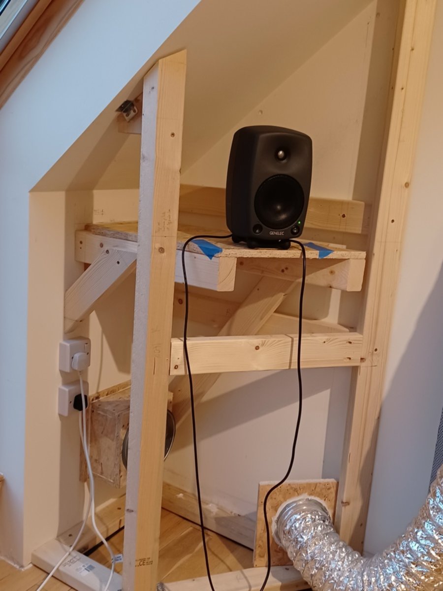 I could feel the shelf & frame the speaker is attached to vibrating at certain frequencies. The knee wall this is fixed to, I couldn't feel vibrating at all. As mentioned before, this wall is very heavy and well damped. There's no direct coupling between those and the isolated soffit baffle structure, and indeed the vibrations didn't seem to pass through into it. This at least is good news