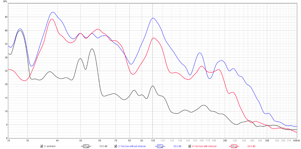 With the fan at high speed the low frequency reduction from the plenum is greater, about 6dB at 38Hz. Fascinating!