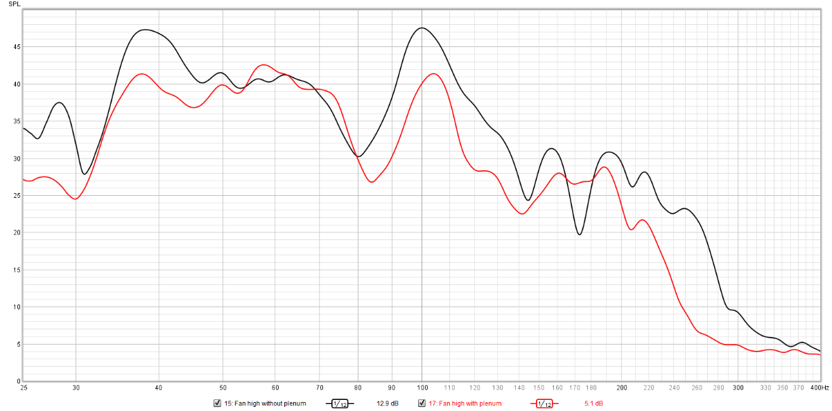 The fan noise is audibly quieter than without the plenum. The rumble around 80Hz and above was probably the most noticeable thing before, so the reduction there is very useful. The fan noise also seems to come from the centre of the front wall rather than the left corner, so that is also a bonus.