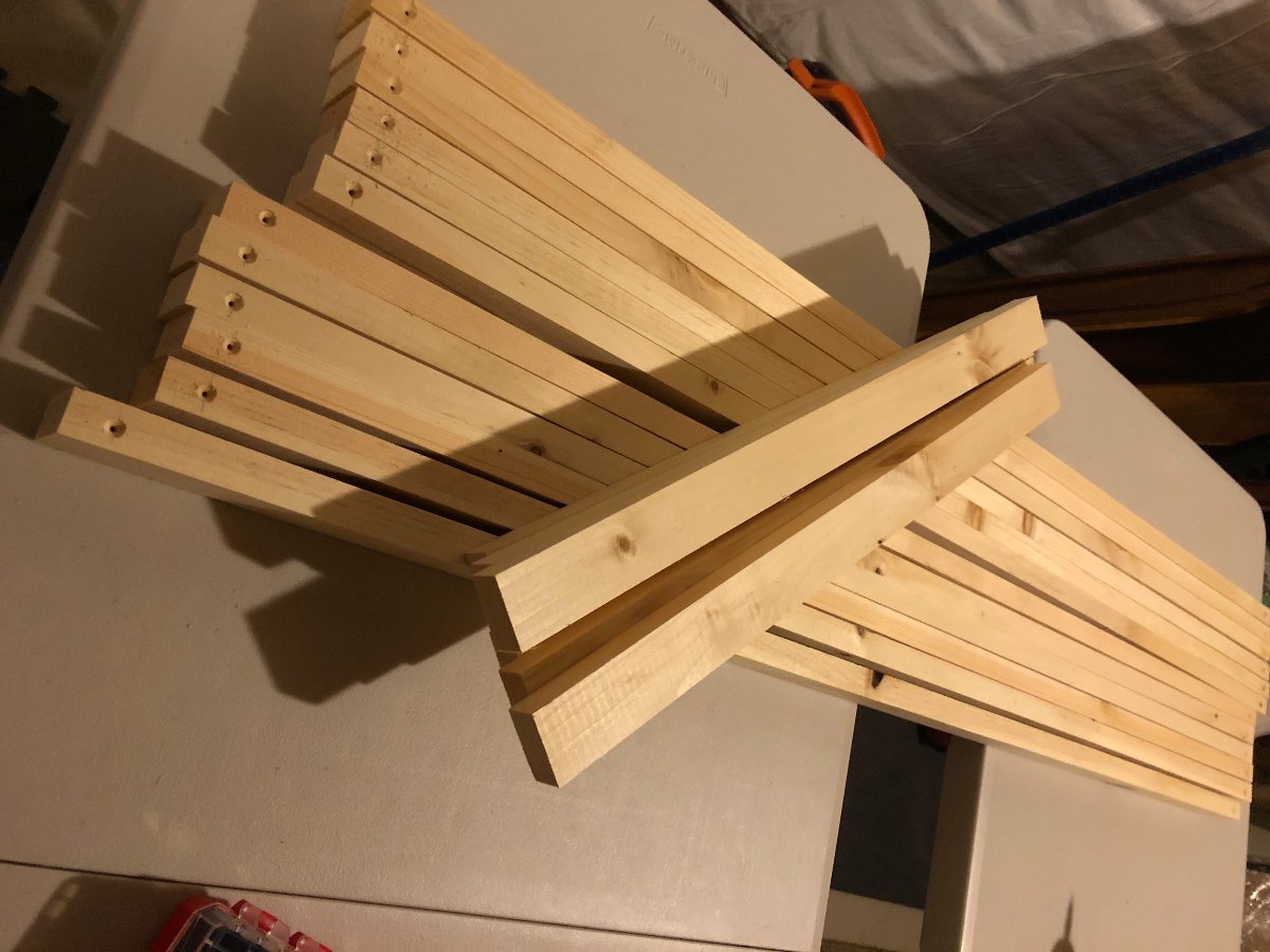 I also have 6 'sticks' that have been stained, and plan to add those on the 4' legs to tie the top and bottom frames. Probably not necessary, but there is a bit of play in the center that I can tighten up. In addition, as things have it, the length of the molding would almost fit with one 8' piece ... almost