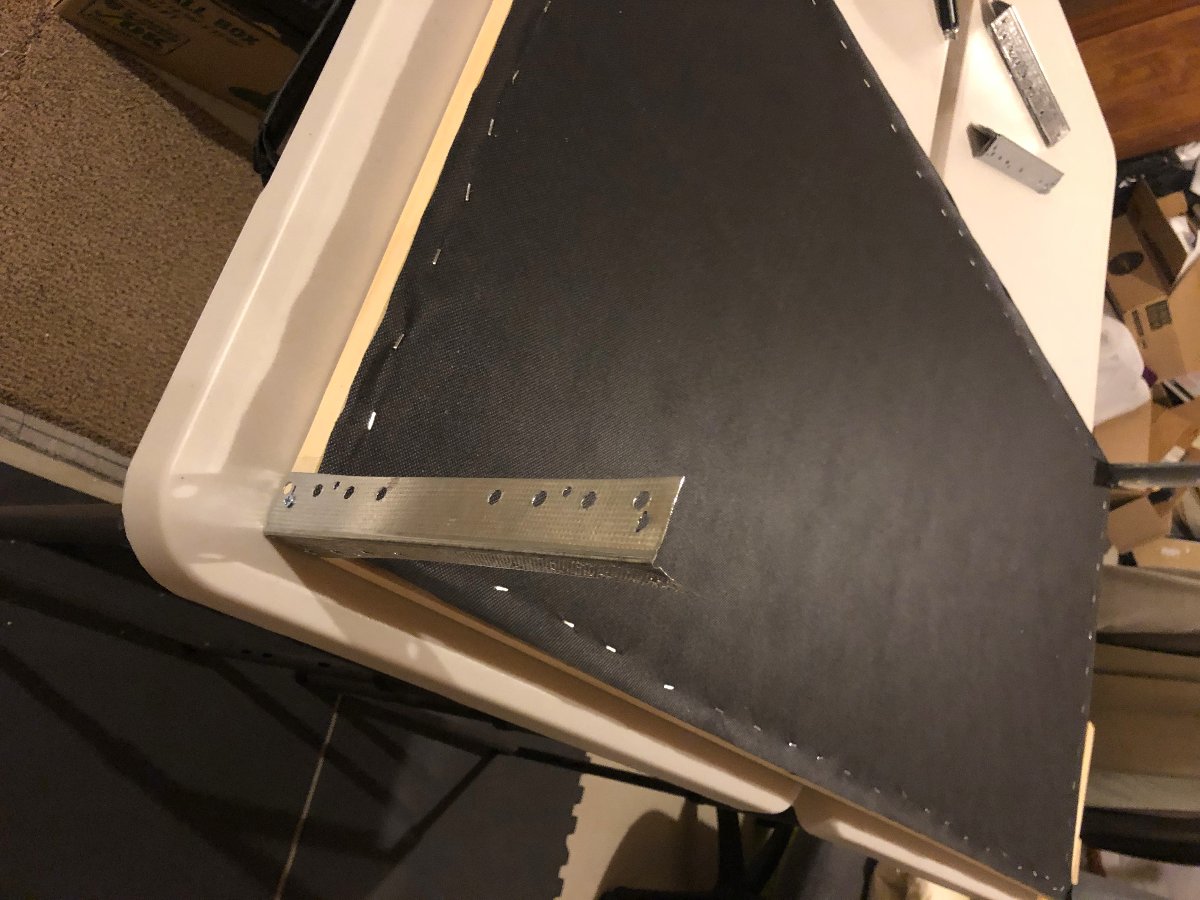 Due to the spread of the fiberglass, it was a bit to get the fabric smooth, even ... but we got it stapled in.