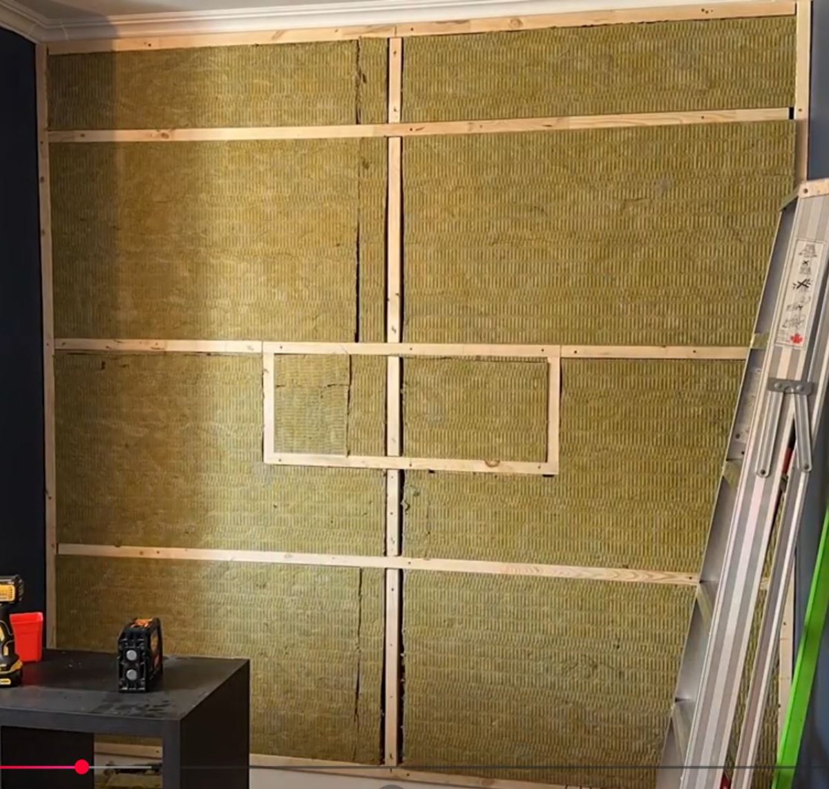 In summary, it involves making a frame to put rock wool in, covered with fabric and then the slats: