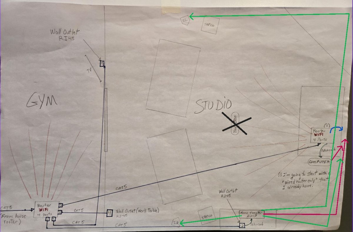 As for the "studio" audio cabling, it's not complicated. Apart from the snake cable I ran in the gym, all the wires/snakes will be in the studio, running along the walls as much as possible or through the storage areas to get from one side to the other.