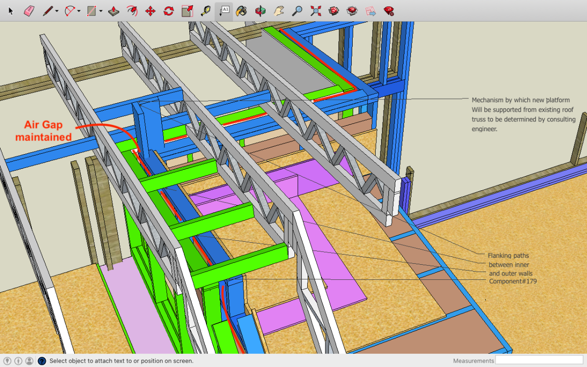 The last 4 images show Option 2: Above the mezzanine; move both inner AND outer walls outward, AND build a new "floor" platform above the existing mezzanine floor. This new "floor" platform would be built in such a way that the double wall system and air gap would be extended from the subfloor, up the walls, through the horizontal floor platform and up the walls to the ceiling trusses. Flanking would be avoided between existing and new mezzanine platforms and would be concentrated at the ceiling such as the rest of the perimeter walls (not shown). Given the added cost and complexity of option 2; I'd like to know if C) this would be the best way to use the mezzanine space to create additional LF absorption in the room (inside the blue framed walls). D) If this is the best use of the mezzanine, which strategy LF absorption strategy would be best given the added volume of space approx 102 cubic feet? E) Might this space be suitable for tuned options versus a super chunk? I know measurements will be key to help me determine this, but I want to start thinking about it.