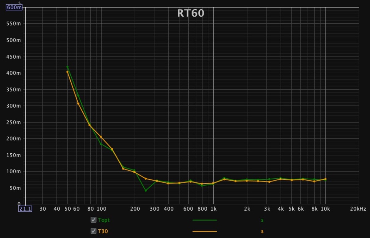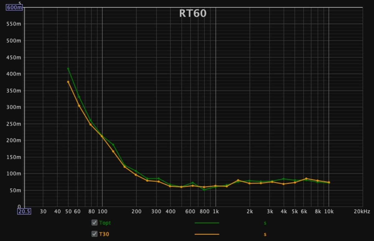 On that same graph you can see that the overall decay times are rather low for your size room: T20 is around 80 ms, and T30 is around 130 ms. I would shoot for something more like 160 ms for that size room, maybe even more if you can. In other words, there is too much surface area of insulation exposed directly to the room, so it needs some type of diffusive/reflective surfaces on top of it. That won't affect the low end absorption (which you need!), but it will improve the mids and highs. You just need to be careful that you don't cause any new specular reflections back to the mix position.