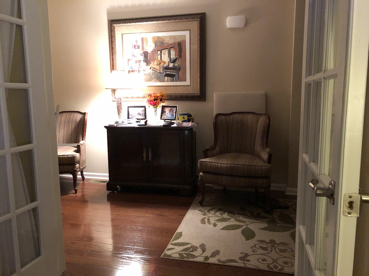 Looking out into the hallway, the chair on the right side has a panel that I placed behind.