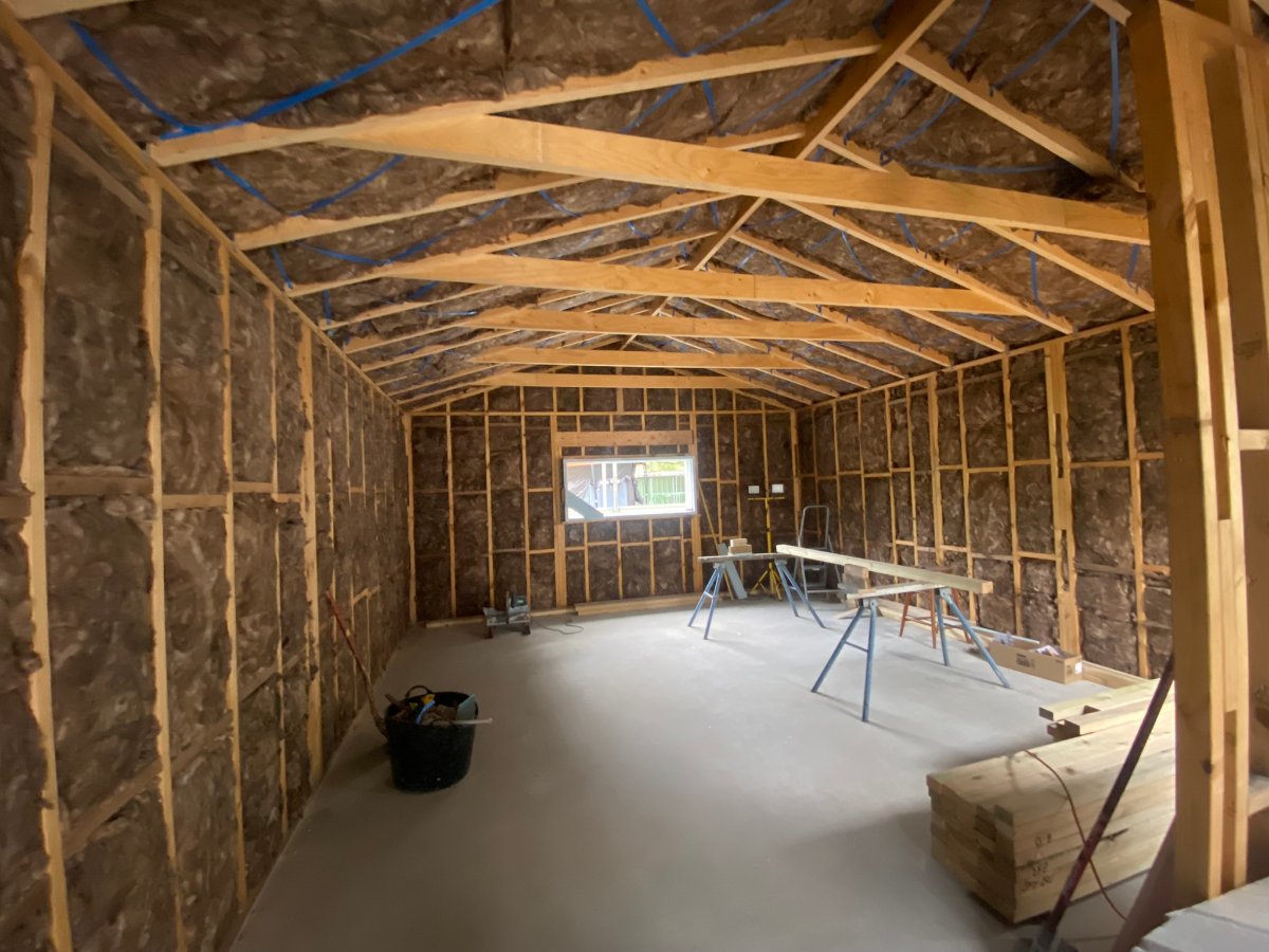 Moisture wrap, cladding and roof going on.