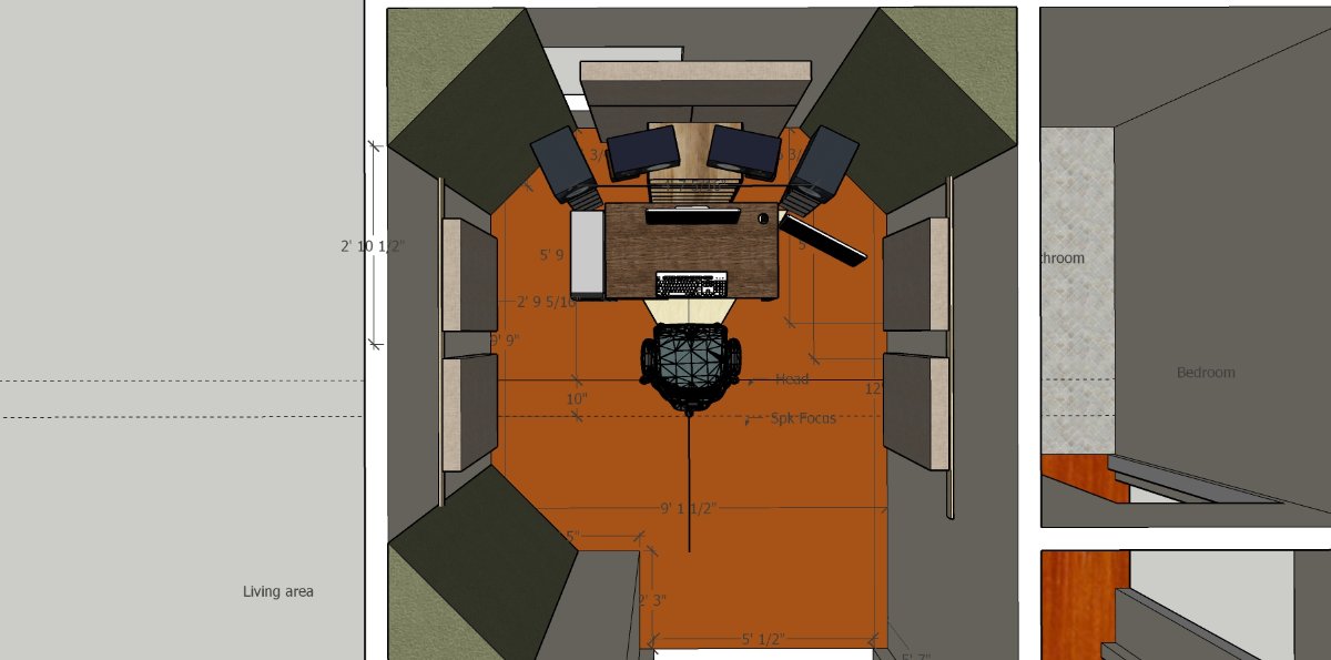 It is a small room, roughly 9'x12' with 9' ceiling. There will be no attempt at sound-proofing, as I live alone, and if I have overnite visitors, I have been working in ... need I say .... HEADPHONES. Yep ... something that I once despised ! Mainly because absolutely nothing I did in them would translate to anything in the rest of the world ... it was just horrible.