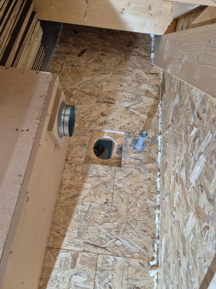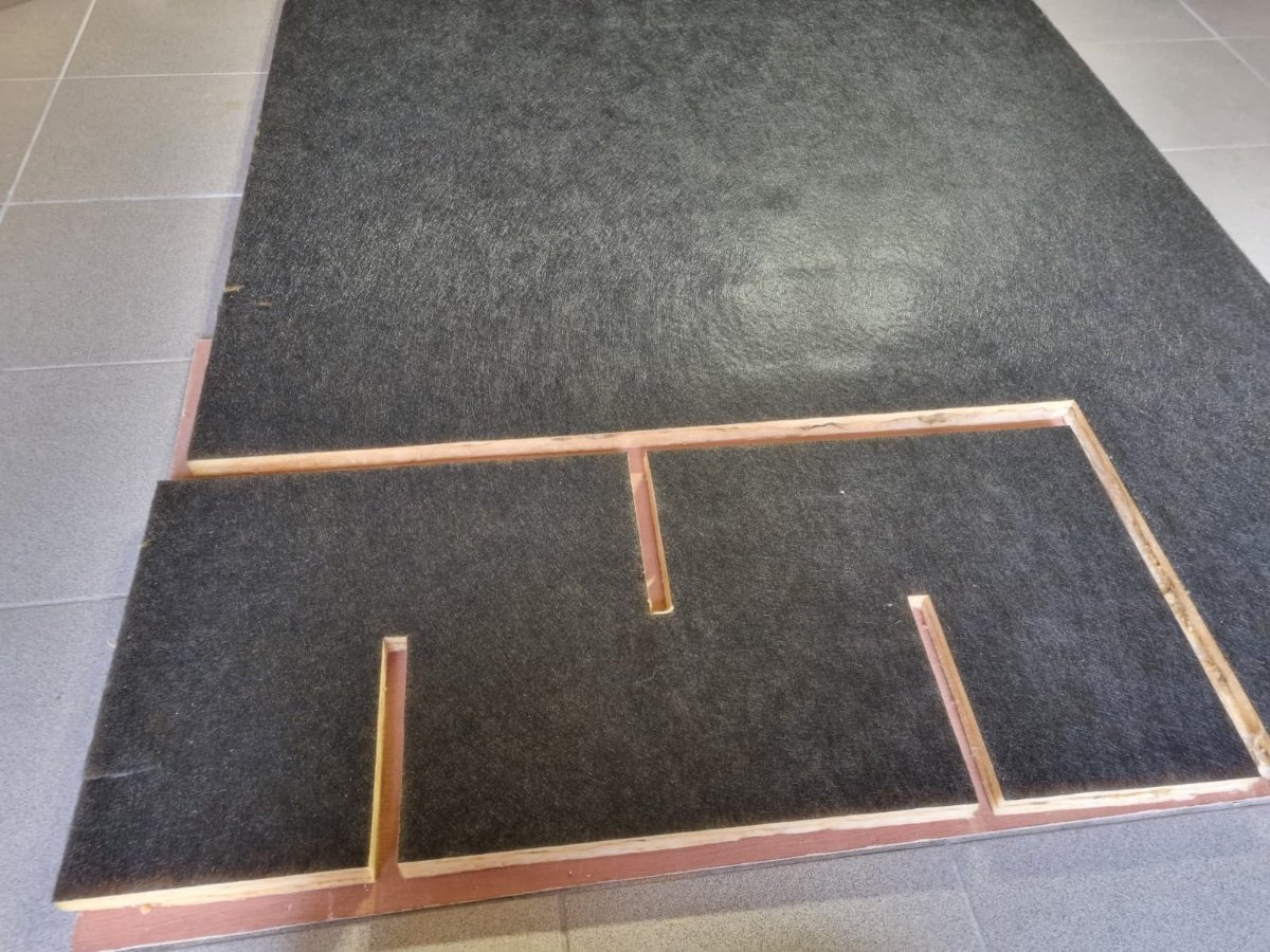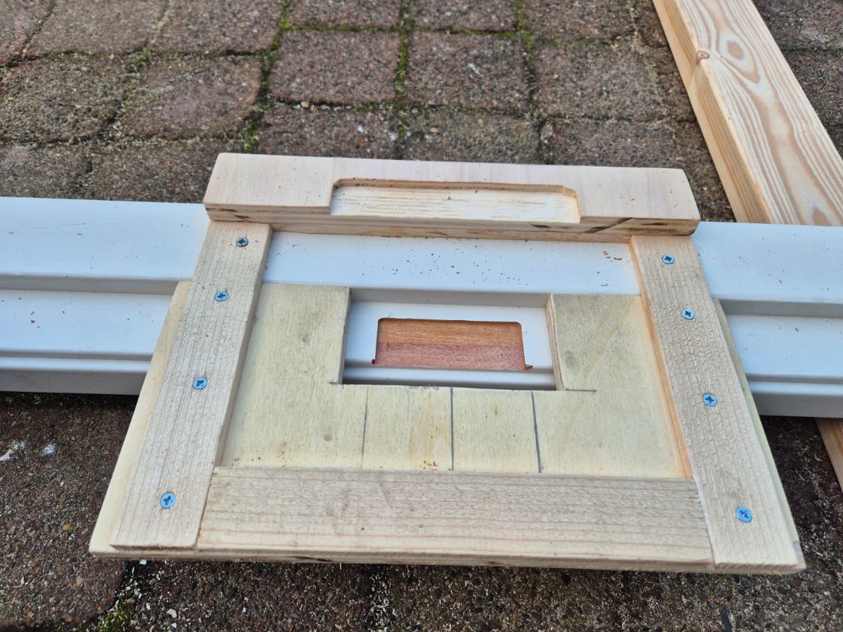 and up she rises! There's not a lot of room around the box (~2/2,5 cm on all sides) but it doesn't touch the other leaf anywhere. There is/wil be drywall covering the whole box (except the part that's between the joists) to equal the mass of the rest of the leaf.