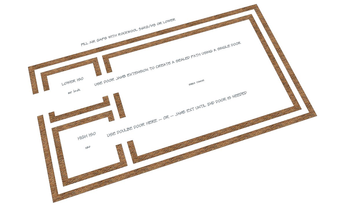 - the "airlock room" is meant to be a machine room - I have some gear with fans, they're 20-30 db loud in mid high frequencies (thought a single wall with some rockwool could deal with this)