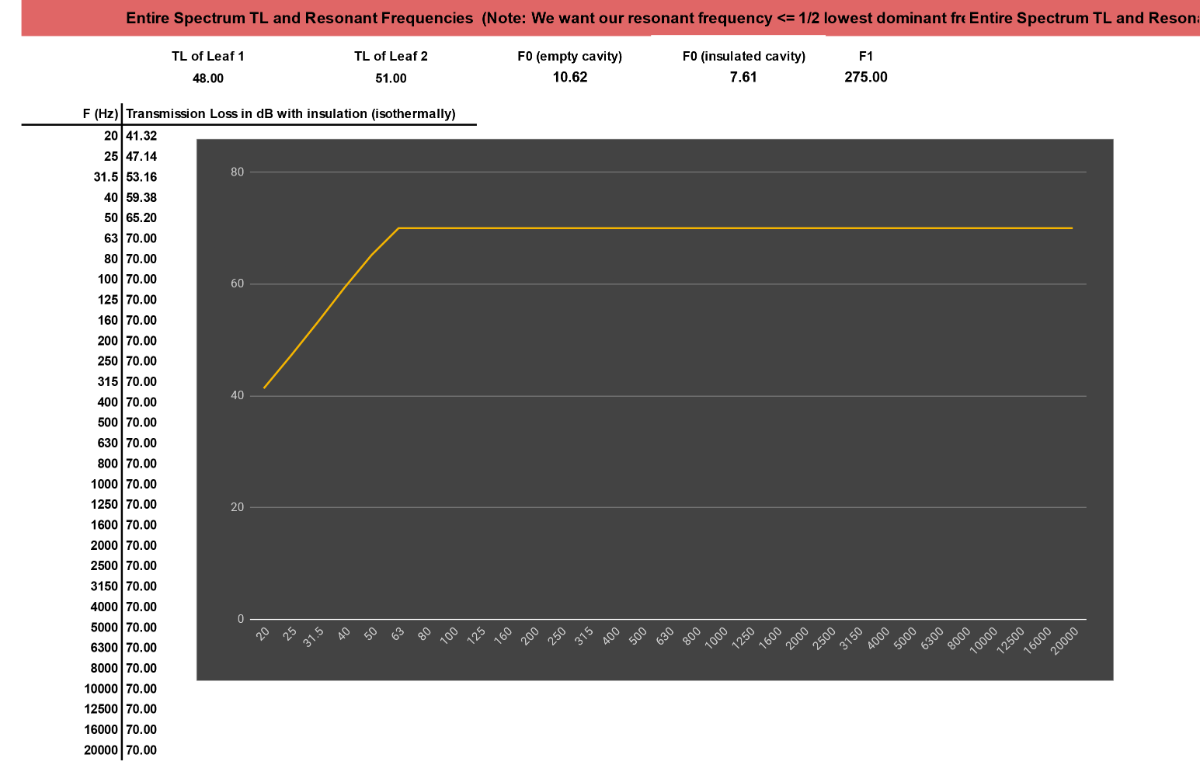 By the way, your math looks fine now, but your graph seems to be off. You should be getting much more than 70 dB for those mids and highs! For most real-world acosutic barriers, isolation rises steadily with frequency, roughly following 2-leaf mass law above the cavity resonance region (R1 + R2 + 6), then again above the coincidence dip. (I would expect to see a coincidence dip in your graph somewhere, too). Yes I realize that you are using a very simplified equation to produce that graph, but if you wanted to be more accurate, you could add in additional parameters to get it closer to the real world. (Yes, I know it's not easy to do! Ask me: I've been trying to create a spreadsheet that produces an accurate isolation graph, for about 20 years now...