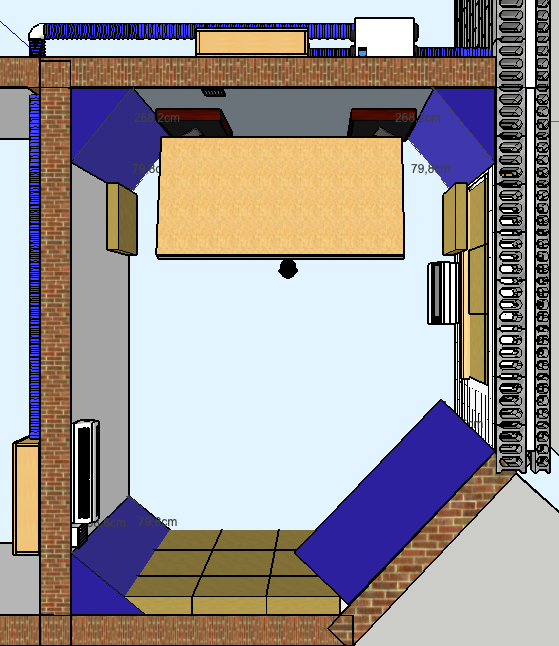 The speakers will be Genelec 8030 with 7050 sub. Though I’m aware soffit mounting would probably be best I could do I don’t feel like being able to construct them properly for now and it also might exceed the budget quickly, so instead I hope to reduce the SBIR issues reasonably by placing speakers, on massive stands, tight against 10cm thick panels and a little bit with speaker cabinet construction.