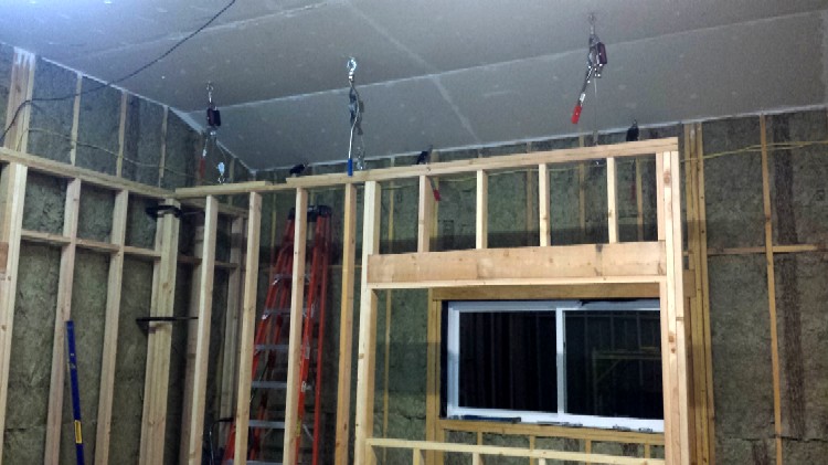Right! More hands on deck can really help to make things go faster, especially with the pre-fab guys just wanted to unload the truck, slap things in place, and get out of there fast. So it's good to give them a heads-up that you'll have people there to squirt down the caulk beads under the sole plates: they'll need to take that into account in their timing. And do yourself a big favor here; get a compressor and pneumatic caulking guns for this! It goes way faster, and the result is better and cleaner. Save your hands... squeezing a manual caulking gun all day will wreck your wrists! Renting a compressor and buying some hoses and a couple of guns is well worth the investment. Or even buy your own compressor, then sell it again when you have completed the studio to recover most of the money You'll find LOTS of uses for a compressor while building a studio...Since I will be up to my eyeballs in caulk with the beefing of the exterior walls and ceiling, I think I'll pay to have someone else do the first bit, if it's an option.