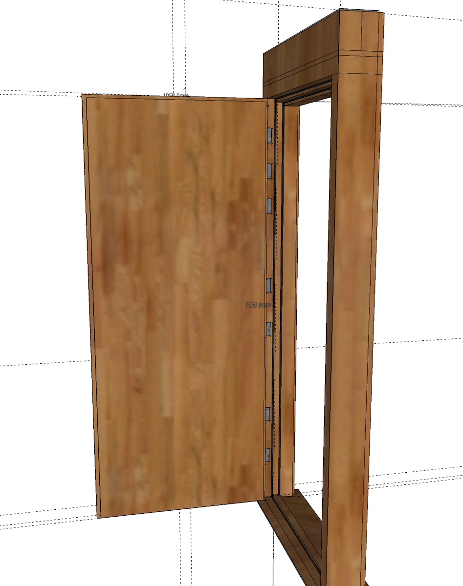 That 910 mm is pretty wide, for a studio door. That's great, actually, as it means you'll have plenty of clearance to get gear and instruments in and out of the room, but on the other hand, it means you will need extra hinges, and they will need to be extra-heavy duty. Think of it this way: when it is open, the door is always trying to fall off the frame. If it could fall off, the fulcrum for that motion would be the lowest hinge (the one closest to the floor). The entire door is trying to rotate around that hinge, and if all of the other hinges failed, that is what it would do. So the entire weight of the door is hanging out there, trying to tear out the TOP hinge, with all its might, by rotating around the BOTTOM hinge. So there's one hell of a lot of stress on those screws at the top, trying to pull them straight OUT of the wood! The weight of the door itself is all in the direction of "down", trying to sheer off the heads of the screws in the BOTTOM hinge, but the stress up high is in the direction of "out", trying to tear out the screws in the TOP hinge along their axis. The wider the door is, the more stress there is on those top screws.This means that, given the width of the door is also set in stone by the supplier to a maximum of 910mm, I am unsure of how to fill in the gaps either side, and above, the door.