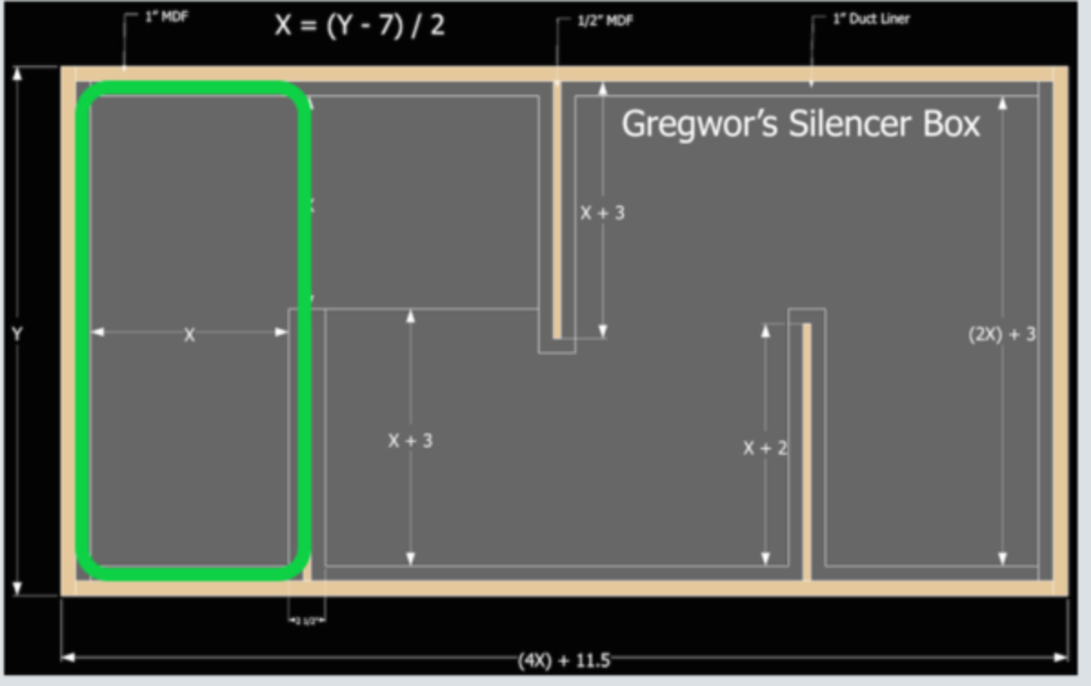Sorry, I should have clarified that better: I'm just talking about the cross-section of the air path through the box. The view you posted is the top view, or "plan view" of the silencer, seen from above: I'm talking about the "elevation view", seen from the front or back of the box. In other words, that image only shows the X and Y directions, but the Z directions is not seen there, and that's what I'm talking about.