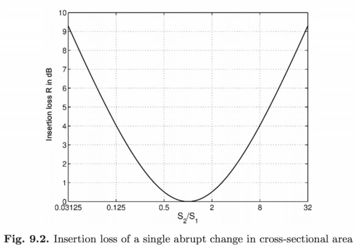 This is why silencer boxes are designed with at least two sudden changes in cross section of at least 200% to 400% or so, as part of the many, many tricks that go on inside, and that gets you a couple of extra dB insertion loss. That's all. In a well-designed silencer box, there's also things like right-angle turns, sudden changes in airflow, tuning, baffles, porous absorption, mass, and a few other nifty bits. All of that, in total, can get you very decent insertion loss. A pair of boxes (one on each leaf, coupled with flex duct), can indeed get you a total TL greater than the TL of the MSM wall itself: commonly of the order of 50 dB, or more where needed.