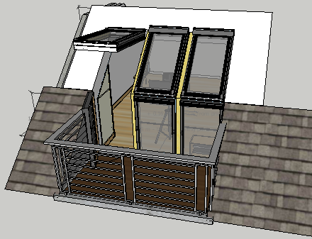 The balcony from room 1 is a Velux roof terrace, triple right handed;