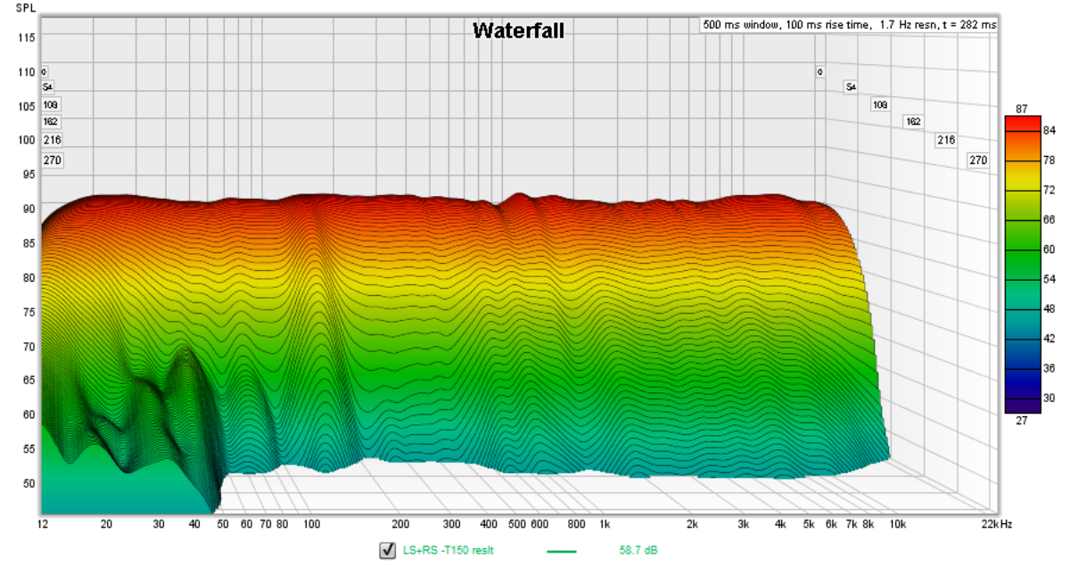 Ahh, what the hell: Might as well go the whole nine yards, and show the FULL SPECTRUM waterfall plot (12 Hz to 22 kHz), smoothed to 1/3 octave: (Actually, that's not really "full spectrum", but rather "even more than full spectrum". Normal human hearing is typically listed at 20 Hz to 20 Khz, so a range from 12 Hz to 22 kHz is extending down almost an entire octave below the bottom of the human hearing spectrum, as well as pushing up 2,000 Hz above the top end. And yes, there really are subs that get down to 12 Hz without breaking the bank, and tweeters that don't freak out above 10 kHz, like some cheap ones do.)
