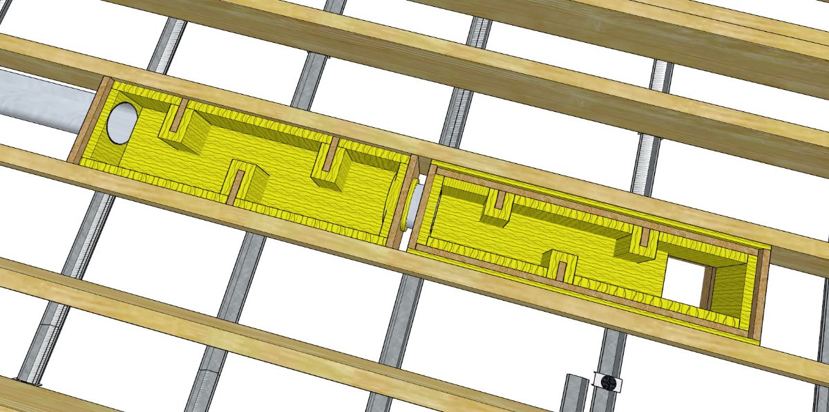 Your silencer box design looks very similar to the ones I’ve just made for my build (thread in construction pages), where it has to fit between the ceiling joists and be constrained by their height and spacing. For a small room you should be able to get enough airflow through them but you’ll need to make them quite long to get the path big enough for the air to slow down inside.
