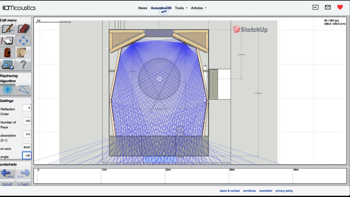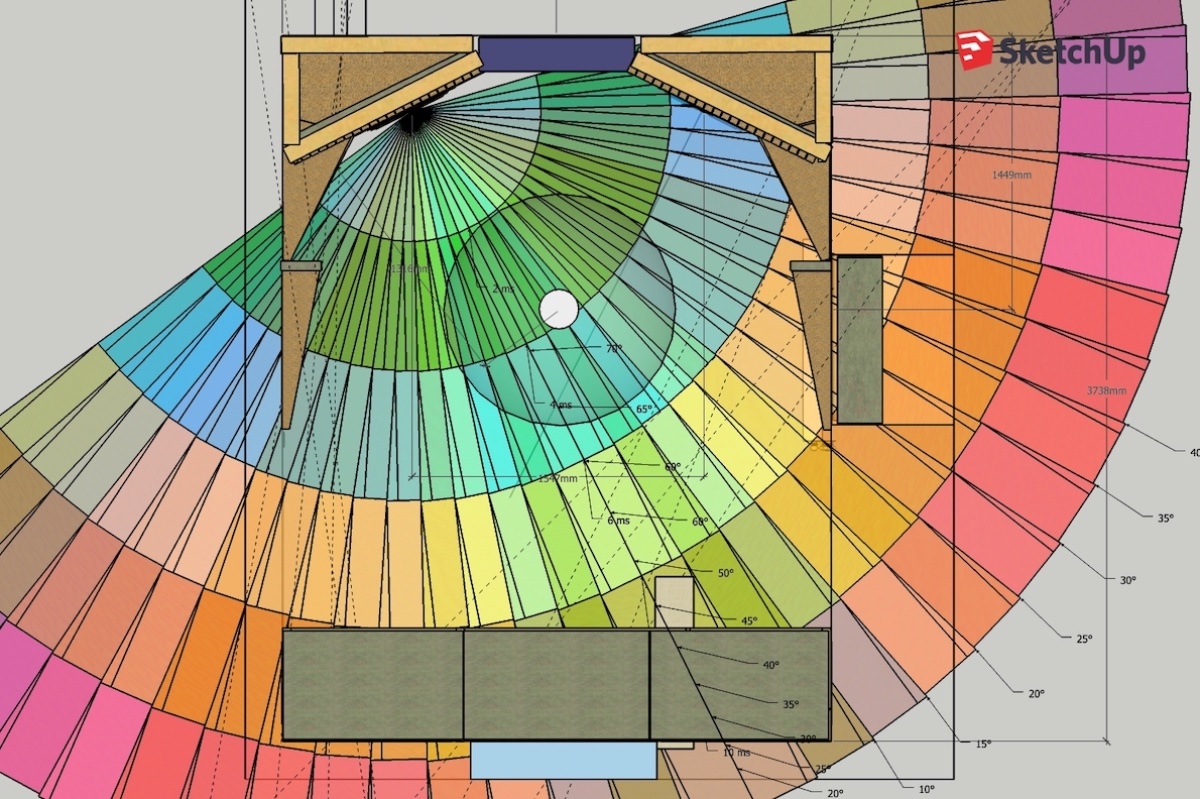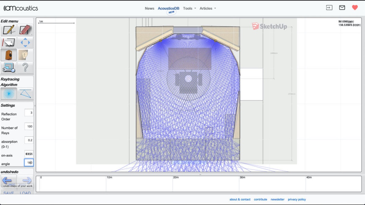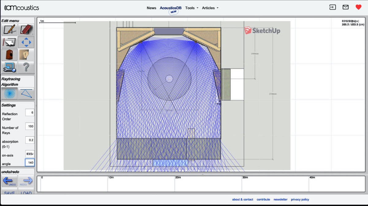 The source of raytracing is the left speaker, the process was done with the Soundman's Raytracing Tool, but I didn't include it in the jpeg because the image dominated by the tool and the traces were not very clear. (see below)