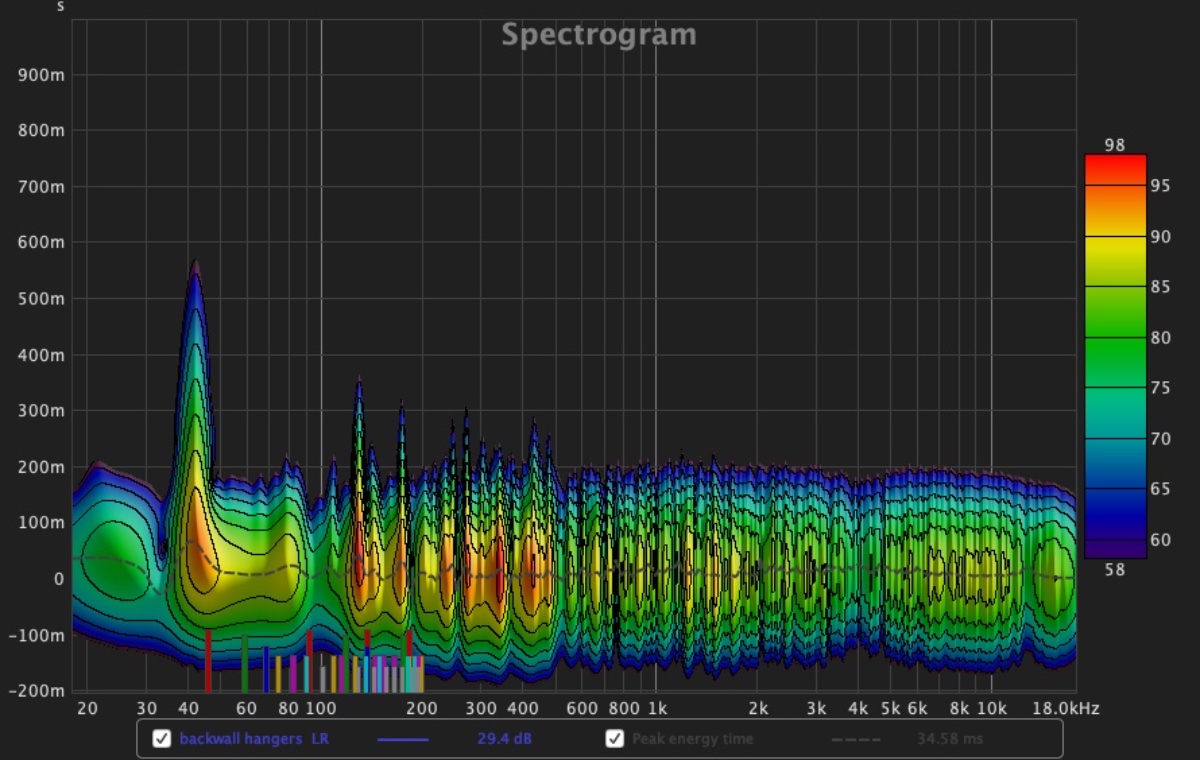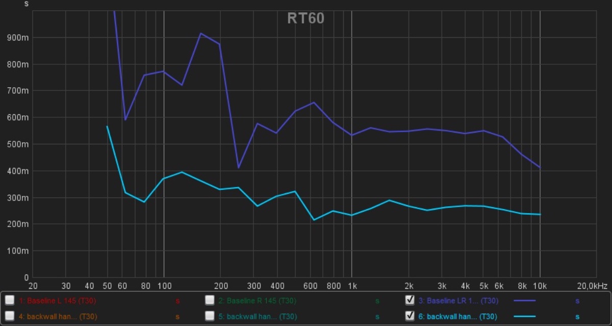 To my -untrained- eye the installation seems successful. By looking the RT comparison alone we can see that the rt has reduced to half, even in the very low frequencies below 80hz. Spectrograms are another fun graphs to watch: all that spikes below 400hz are greatly damped, even that 45hz monster. One can notice that in the hangers version that mode has shifted to 42hz, because travelling in insulation the speed of sound is reduced and it takes more time to make that 60cm to the wall, so it "thinks" is a bigger room.