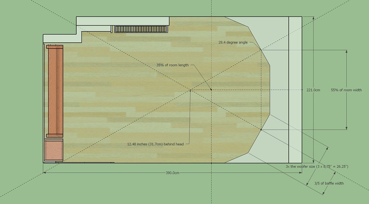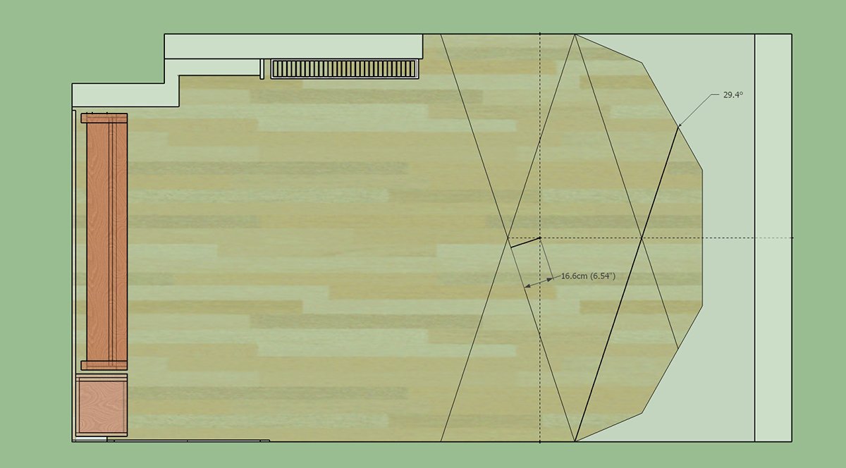So I used amray (https://amcoustics.com/tools/amray) for a general view of all the 1st reflections (the pics w/ all the blue lines - very rough as you have to trace lines over a top-down 2d export of your design), made a note of all the ones closest to the head then went into Sketchup and calculated the closest reflections w/ the protractor tool