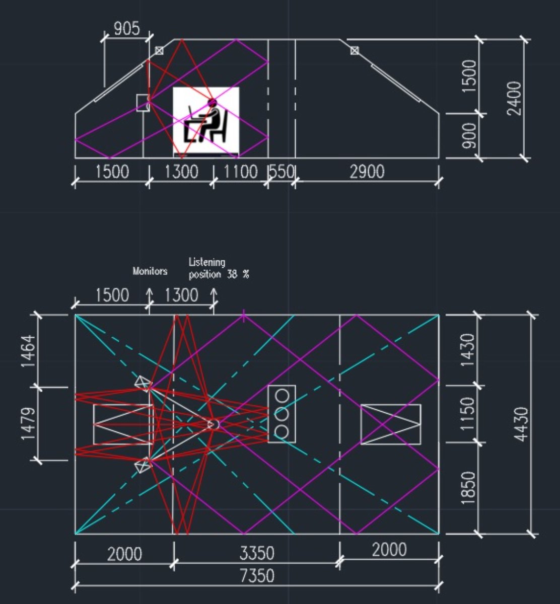 I'm building a studio in the attic. I'm not a professional, but I know how important it is to have good acoustics in the studio, a flat response. I read the instructions for the acoustics treatment of classical rectangular rooms (SBIR, 38% listening position, center of the room - bass cancellation, bass traps, absorbing acoustic panels, diffusers, etc.). I am writing this post for the atypical size of the room. Can you advise me on problems with the acoustics of this attic? I am sending a drawing of the attic with the layout of the monitors (Yamaha HS7) and the listening position. The initial treatment of acoustics would be to make absorbent acoustic panels for the first reflections (ceiling, side walls, front wall), vertical corners of the bass trap. I don't know what to do with that chimney which can be a problem because the listening position is between the monitors and the chimney. Apply a diffuser to the entire chimney behind your back? The back of the room is a combination of absorbing acoustic panels and diffusers? On sloping walls there are Velux roof windows, walls and ceiling one plasterboard 12.5 mm with mineral wool 100 mm, concrete floor with carpet. I will be happy for any advice. Excuse me my english is very poor.