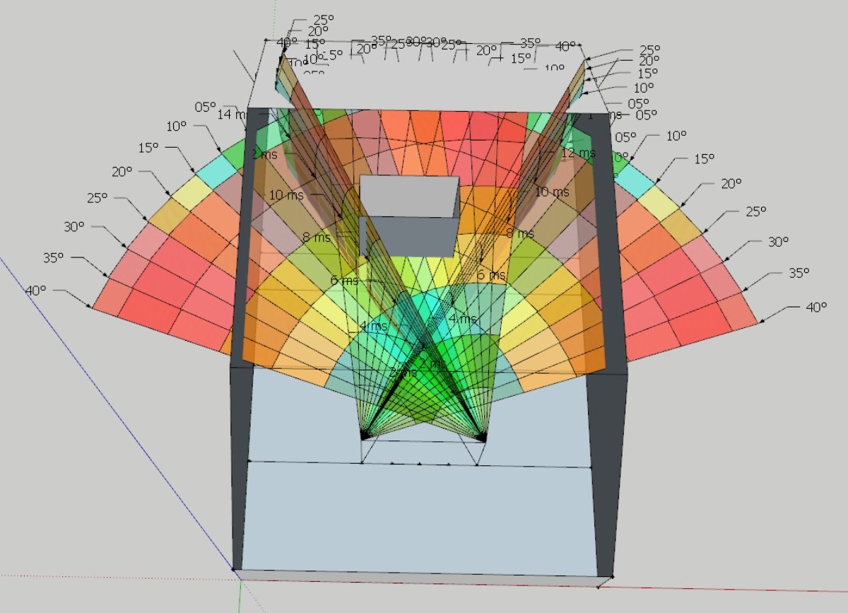 If I moved the speakers away from the front wall, I would get close to the center of the room with the listening position (green diagonal lines on the original floor plan - low bass). This condition may not apply if there is an obstacle chimney.