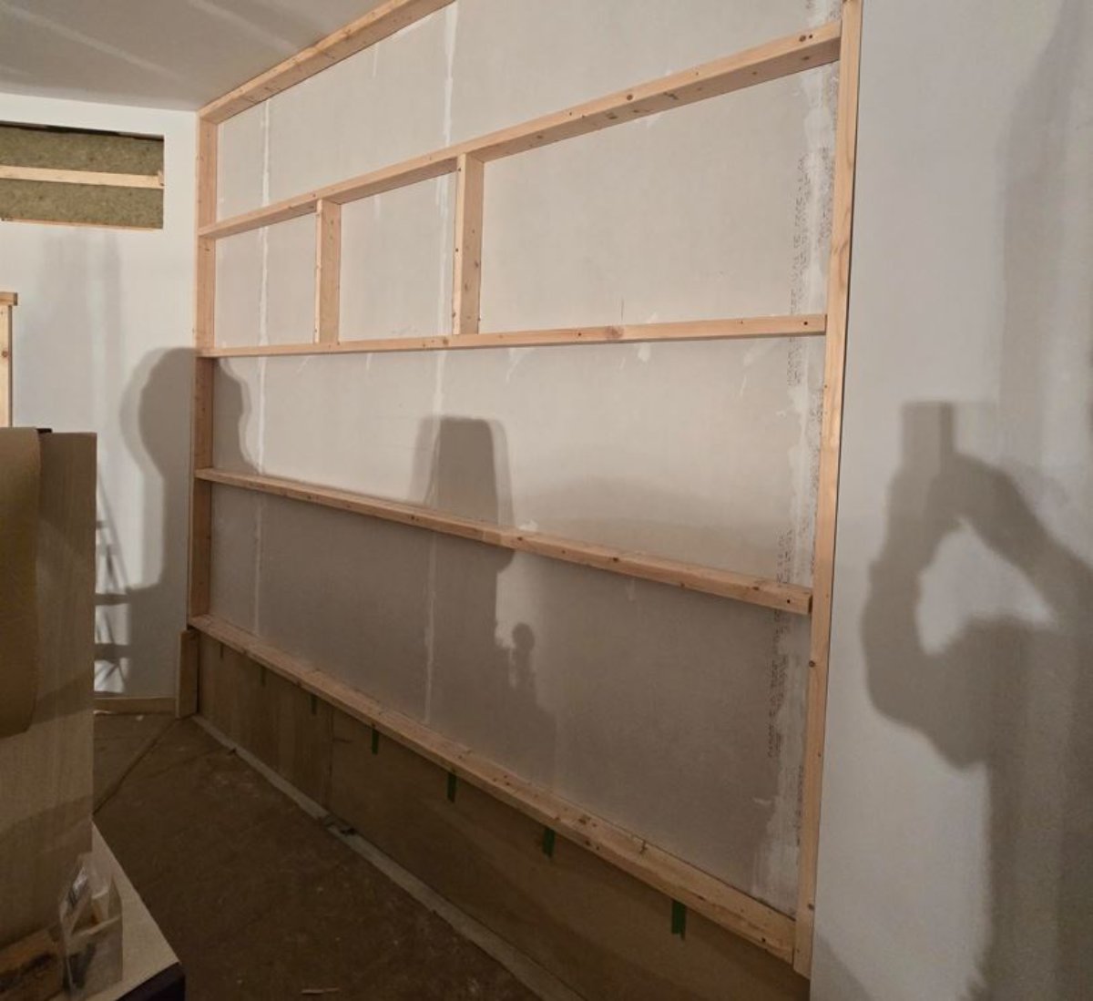 - Glued 1/4-inch plywood to the blue Dow insulation at the bottom of the back wall, carefully replicating the 2x6 stud marks to attach the TV brackets.