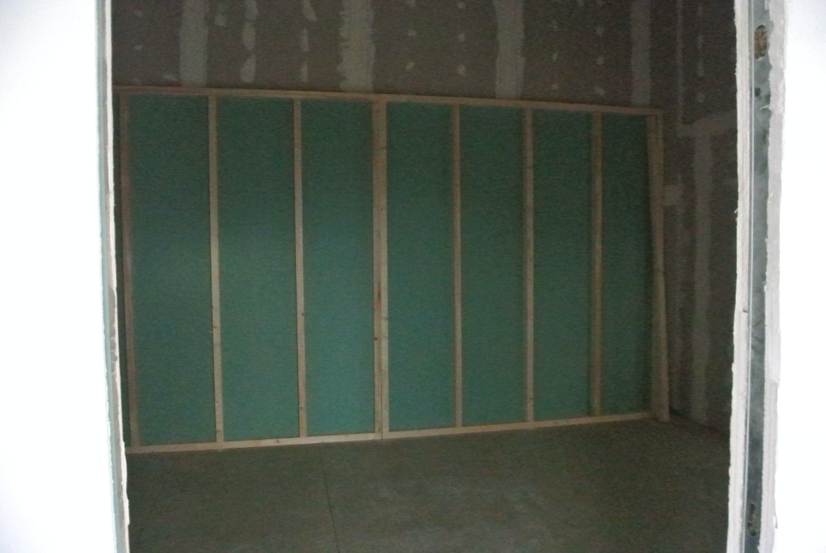 The initial framed walls with pine beams were constructed in three layers: plasterboard, acoustic dead sheet, another layer of plasterboard. Because they are only two people they had to frame them in sections rather than the entire wall at once.