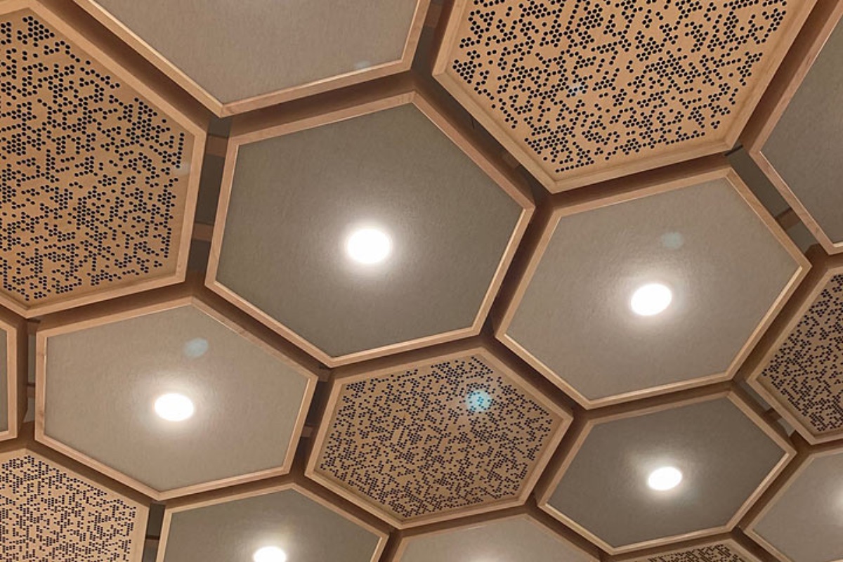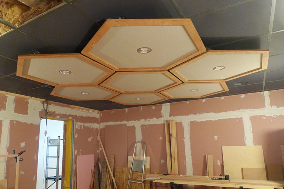 The hexagons are something I wanted to do as I don't feel so creative sitting under an office drop ceiling. These were not part of my studio designer's plan, I got inspired by this Wes Lachot design.