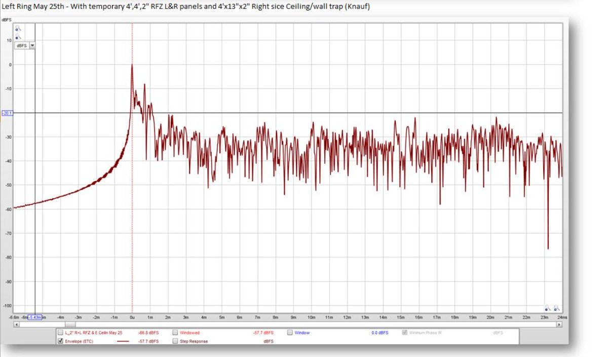 I should first point out that the left and right first reflection RFZ panels were not present in the data you looked at, so that isn’t a big surprise. I just didn’t know how to test for it, but now I do. I had been wondering if the wall/ceiling corners would need treatment and this test answered my questions well. The interesting thing is that the wall/ceiling corner above the right RFZ panel is 90 degrees….,