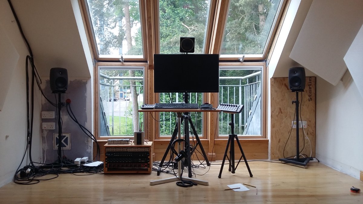 Works for me. A photo of my building site of a studio from a few weeks ago. The desk has enough space for a computer keyboard, trackball, Presounus Faderport, and TC Electronic BMC-2 monitor controller (out of sight behind keyboard). The rack has 3 x 8 channel mic preamps and headphone amps for musicians - 6 channels. A few people have described it as minimal, but it really is not; out of earshot, as you say, is more like it.garethmetcalf wrote:Maybe for both of us there's a case for moving to a small desk and then separate rack furniture out of earshot...
