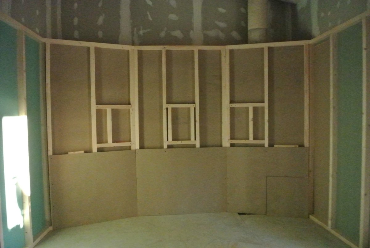 Good progress is being made on the control room now. The front wall is nearly complete and super dense as it is filled with sand nearly up to the top and then with compressed foam close it off and stop any reverberation with in the wall. They did the first layer of dead sheet with a material that is made of old clothes that are shredded up and compressed into a roll about an inch thick. After this was applied all the way around the walls, the cellinet boards were attached to the beams. The room has almost no reverberation at all now. Incredible change in the sound. Tomorrow they do the ceiling with the deadsheet and 1 inch thick fabric. They will also add the fabric frames on the top and then the bass traps.