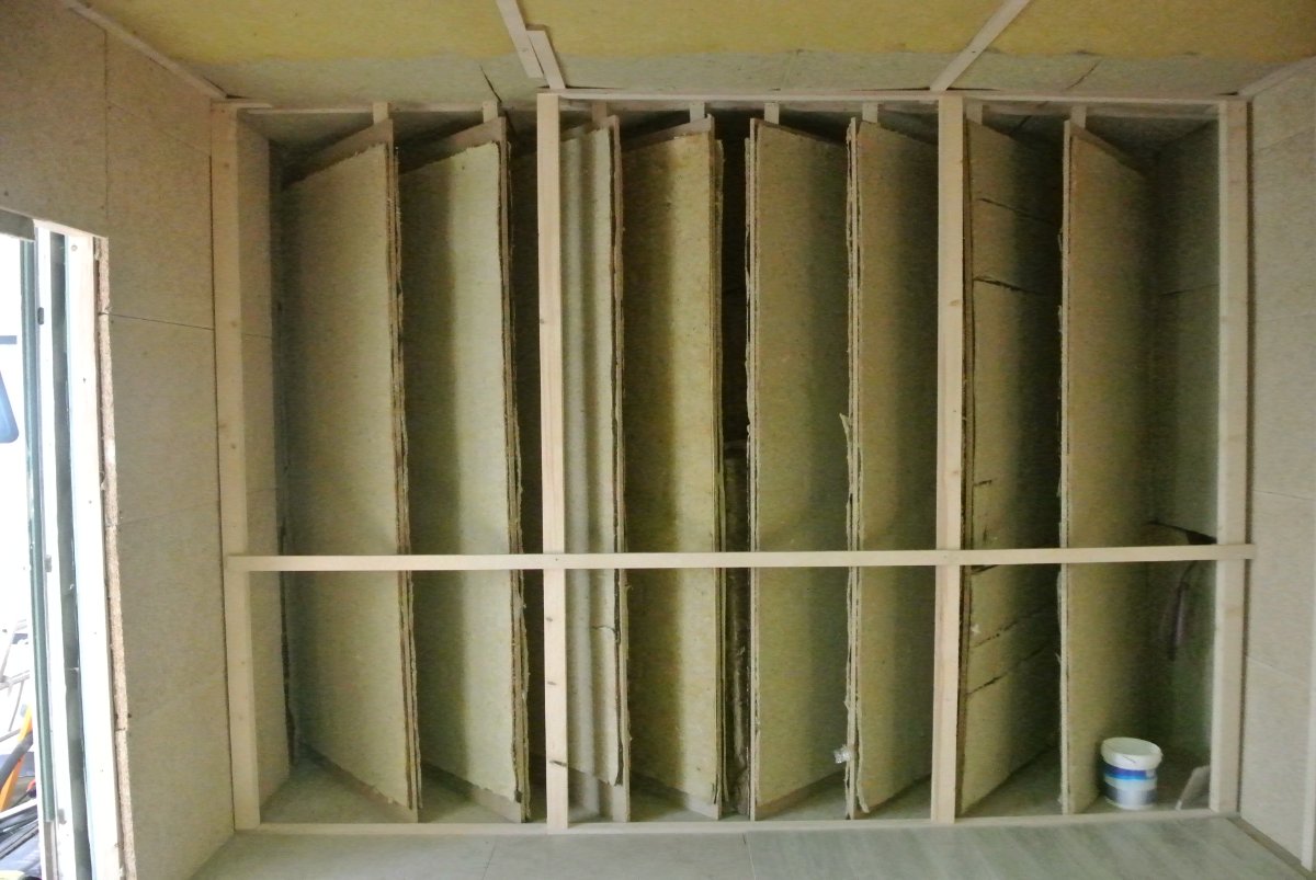 Control Room: This week the bass traps at the rear where completed, the front wall was tiled, the wood floor panels put in, the fabric frames for the walls (they do the ones for the ceiling tomorrow), the fabric arrived and that is about it.. Here are some pictures..