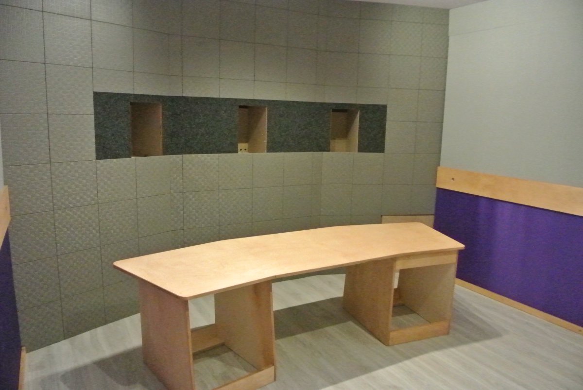 A picture of the control room with the stained desk (not yet assembled and I also realized one of the 19" rack bays is backwards.. You get the idea anyway... Looking amazing....