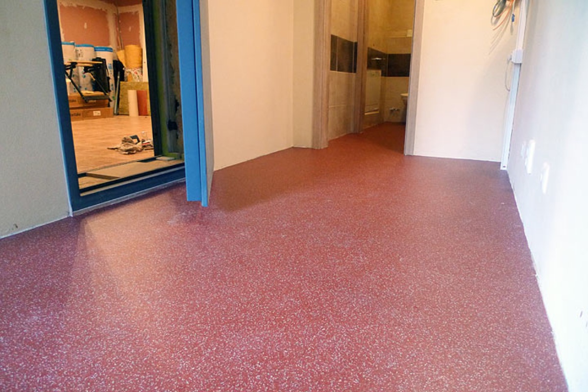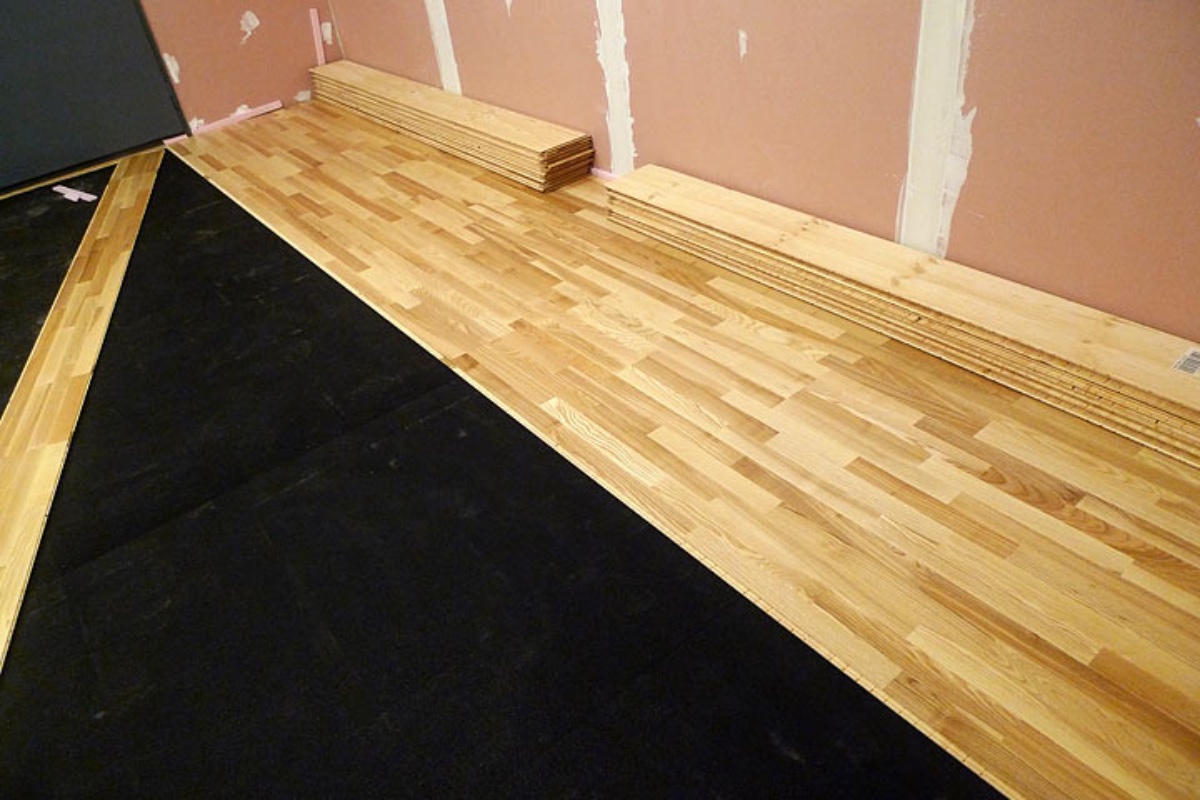 3mm (that's about 1/8th of an inch) of Regupol was glued to the old tiled floor. I studied about whether to glue or loose-lay the Regupol and decided to glue it. Having finished I would say it made laying the wood easier.