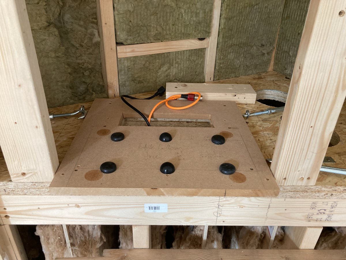 Glenn proposed that my soffit mounting wasn’t working as well as it could. In the first incarnation, despite calculating, measuring and cutting carefully it seemed my boxes were compressing the sorbothane hemispheres more than they should, so the speaker vibrations were travelling into the box and therefore into the structure.
