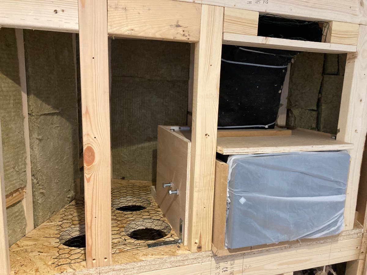 I then reconnected the speaker heat ‘exhaust pipe’, added some mesh over my new holes in the shelf and put all the lovely rockwool back in to the cavity.